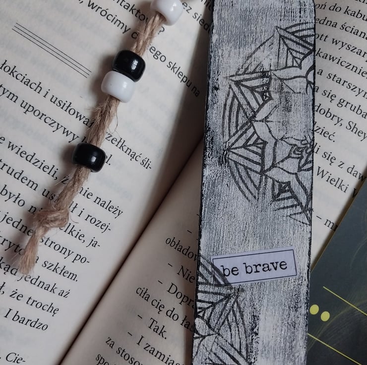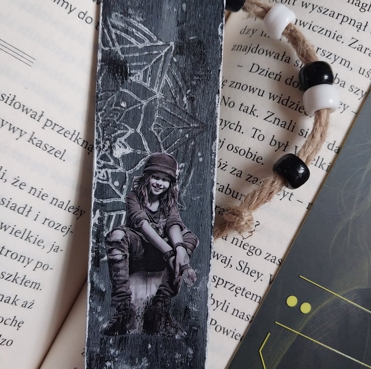 Wooden bookmark featuring a boy character. I have painted the wooden bookmark and decorated it with stencils and stamps. An eco-friendly rope with beads has been added.