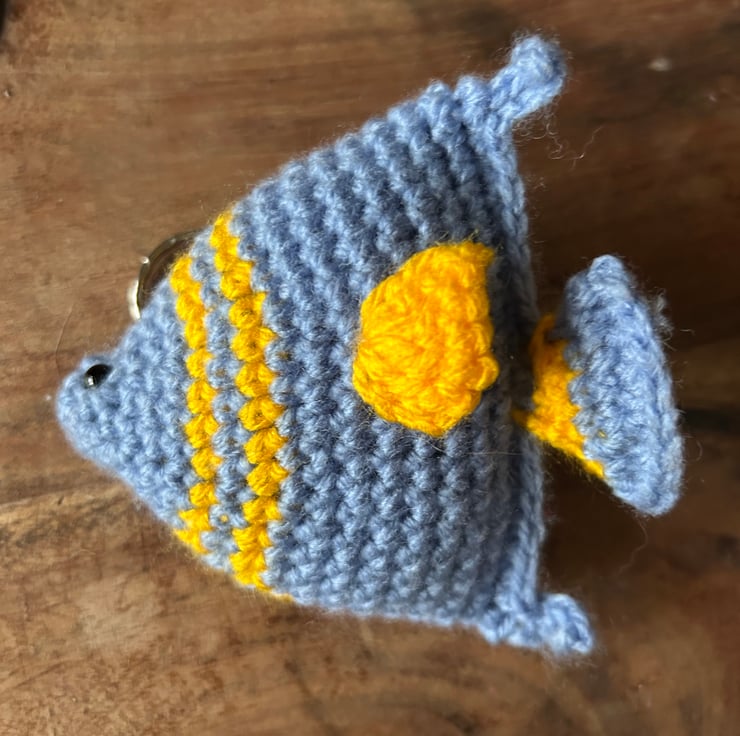 Freddy is a sweet little blue angel fish, lovingly crocheted by hand and full of charm. With his soft wool body and bright safety eyes, he makes a delightful companion for keys, bags, or as a small handmade gift.