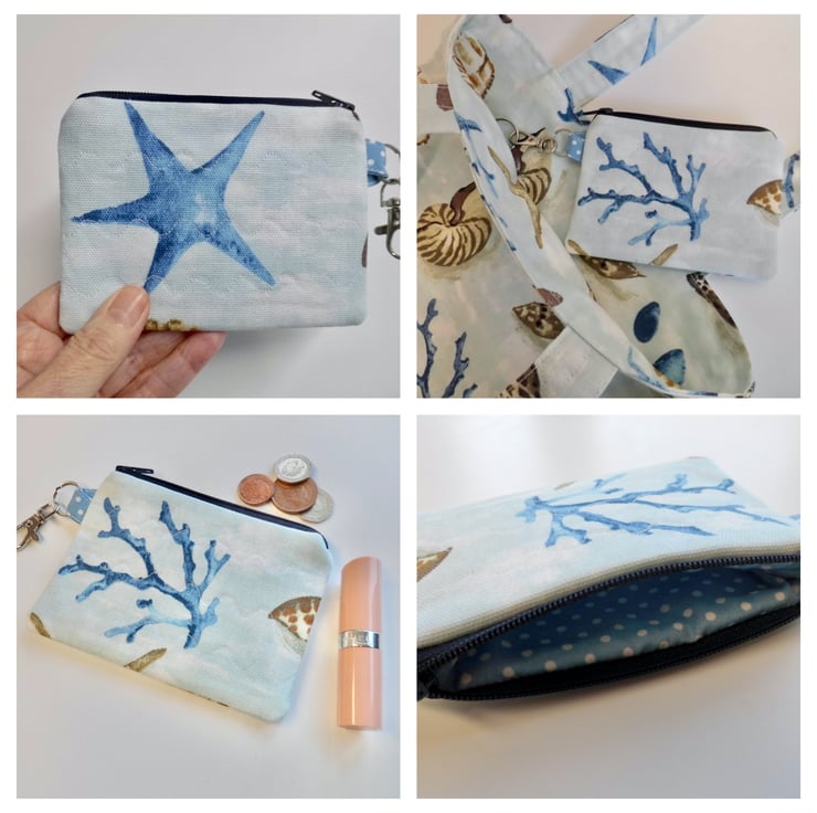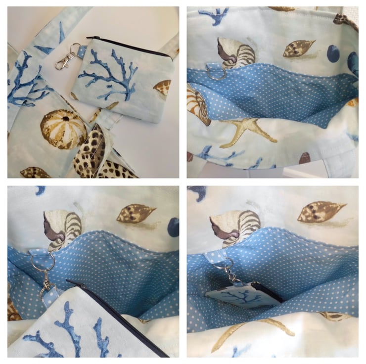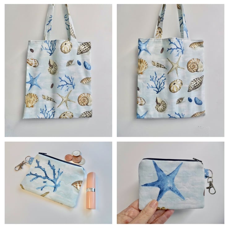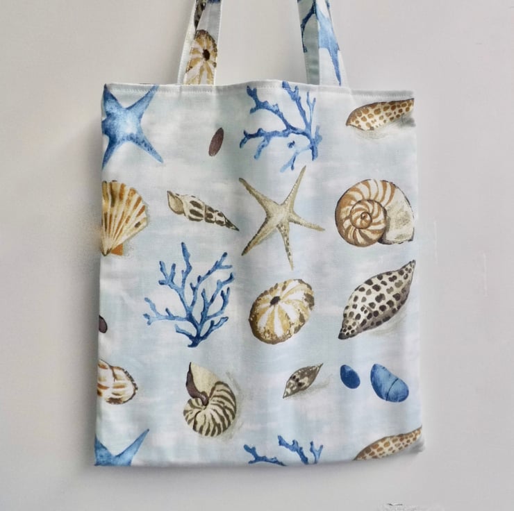 This tote bag with matching purse is made with a medium weight cotton furnishing fabric. Pale blue/green background with a print of seashells, starfish and coral.