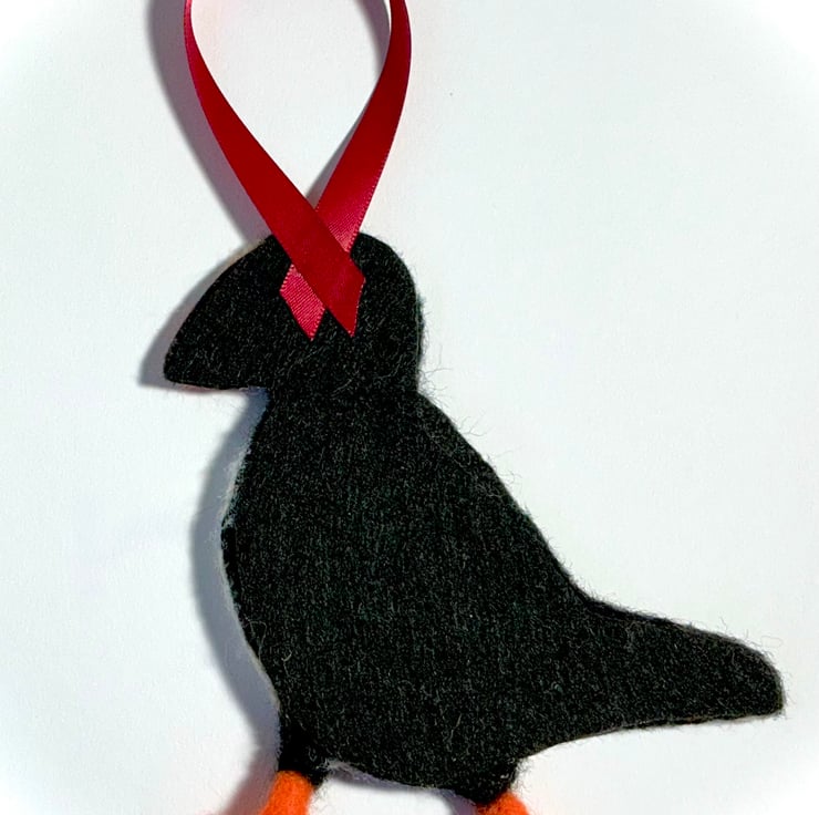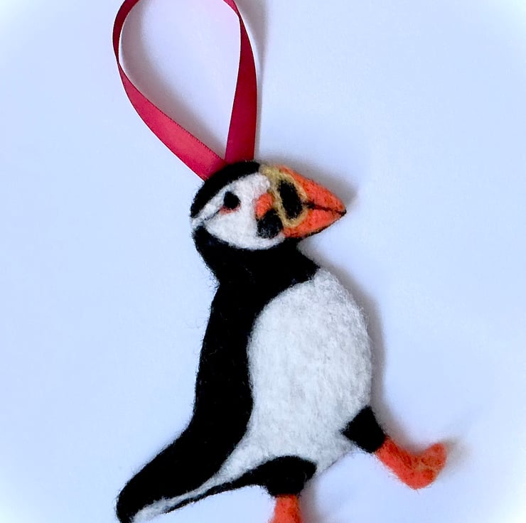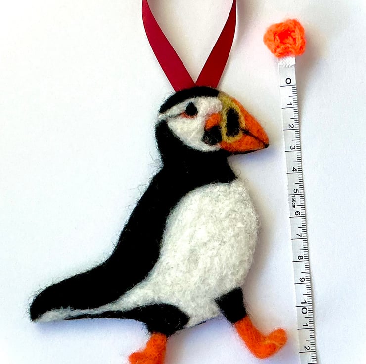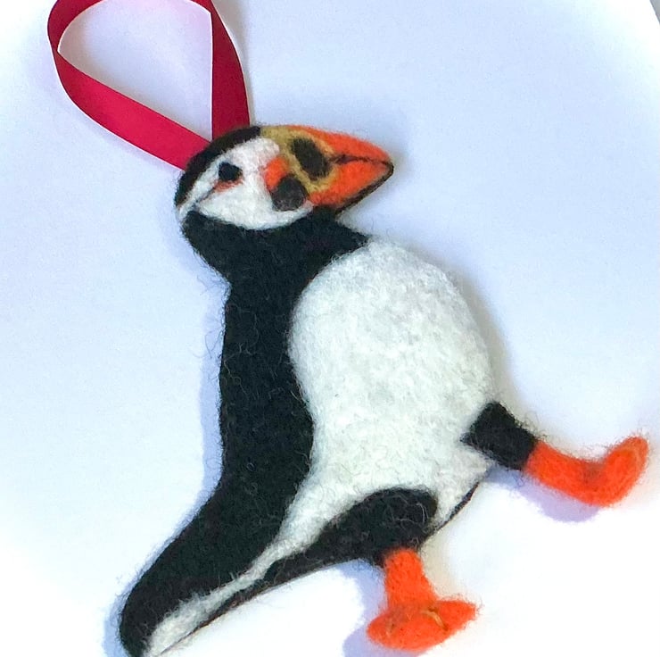 Needlefelted Puffin hanging decoration made using woollen fibres with a Black felt backing.