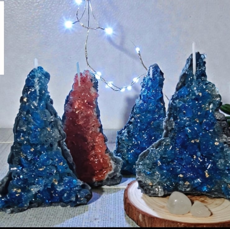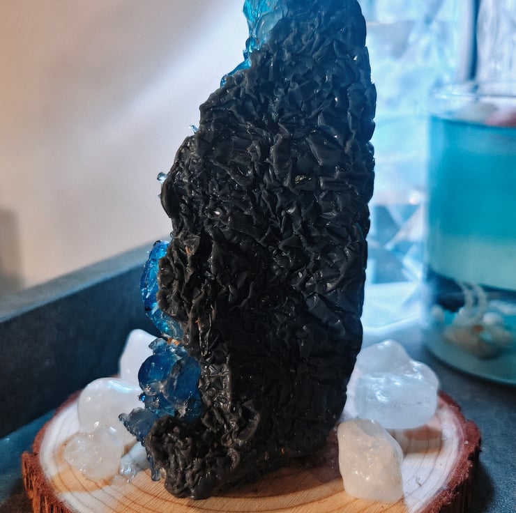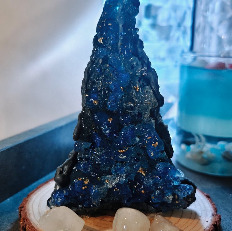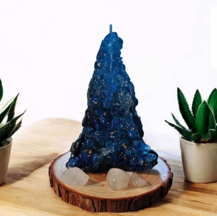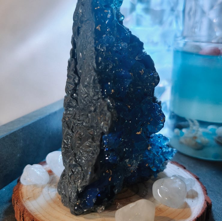 Elevate your space with this stunning handcrafted blue crystal candle. Its one-of-a-kind design features a textured, crystal-like appearance with a rich deep blue hue, accented by subtle golden flecks that create a mesmerizing shimmer when lit. Perfect for adding elegance and serenity to any room, this candle makes a beautiful centerpiece for your living room, bedroom, or meditation space.