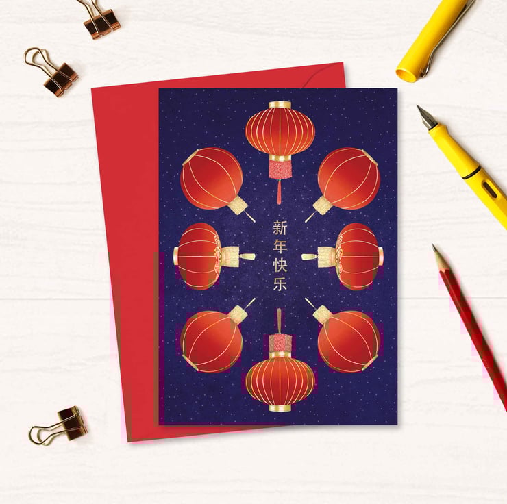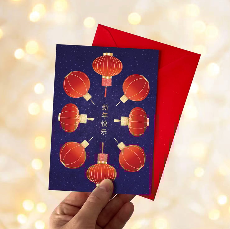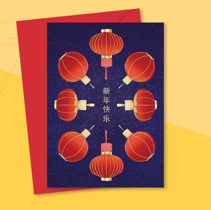 Inspired by the glowing lanterns that light the night during Lunar New Year celebrations, this card reflects wishes of happiness, prosperity and good fortune. The circular arrangement of lanterns symbolises unity, renewal and togetherness for the year ahead.