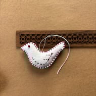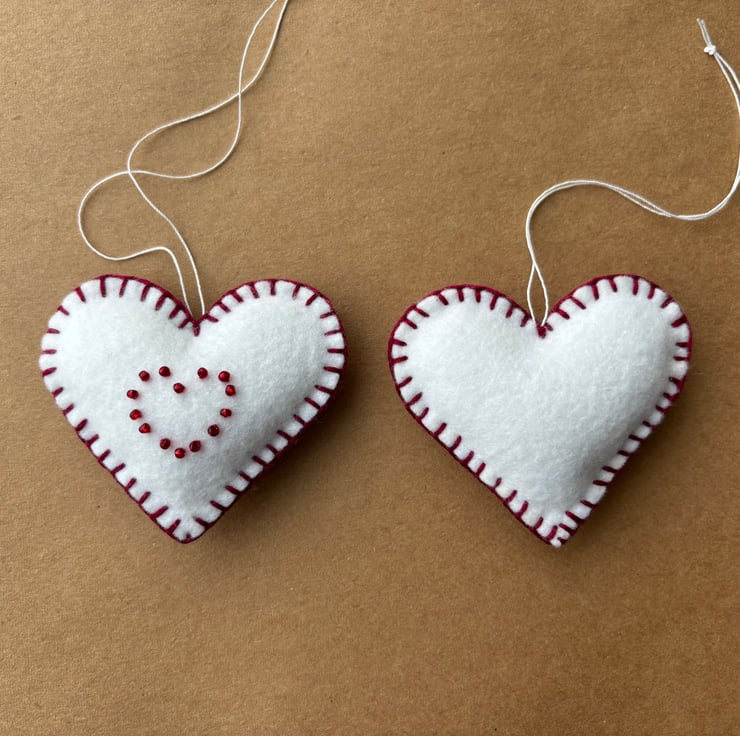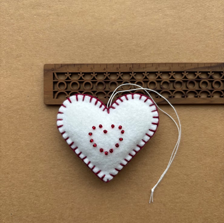 This hanging heart decoration has hand sewn beaded detail on one side and a blanket stitched edge.