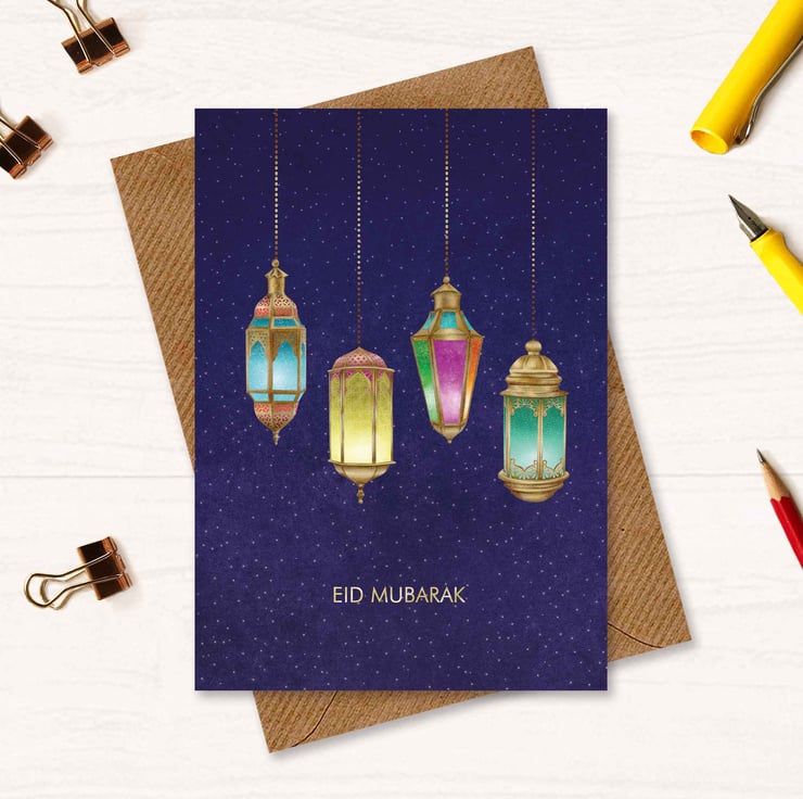 Celebrate the spirit of Eid with this beautifully illustrated Eid Mubarak greetings card, featuring four hand-drawn Middle Eastern lanterns, each glowing in vibrant colours with detailed, intricate patterns. Perfect for sending heartfelt wishes to family, friends, or colleagues, this card is a thoughtful way to convey your blessings and share joy during this sacred celebration.