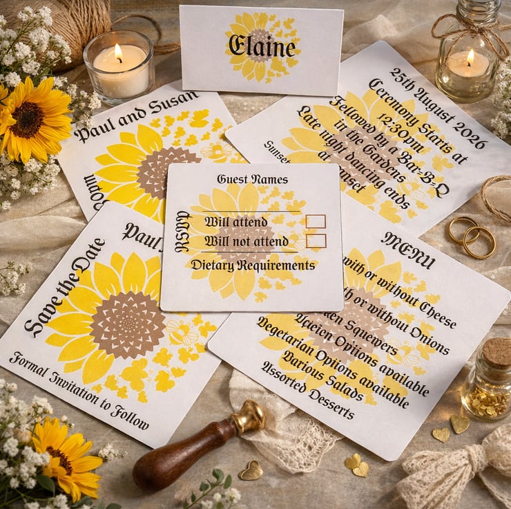 This design is part of a fully matching sunflower wedding stationery set.