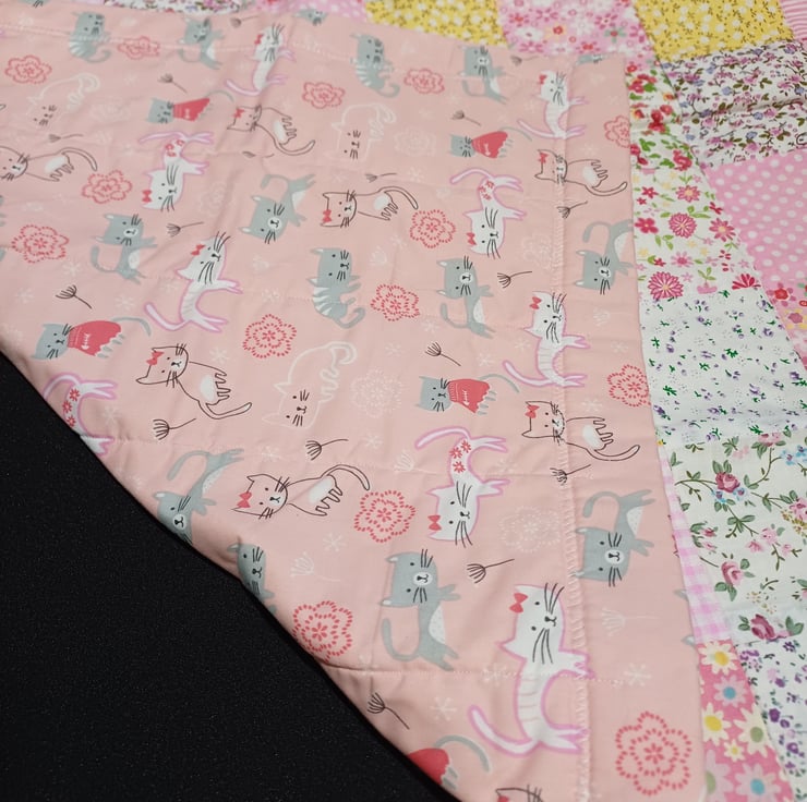 This beautiful play mat measures 30 inches by 30 inches approx. The top layer is a mixture of poly cotton and cotton patchwork squares, the middle layer is a thin wadding perfect if the mat is used for a blanket so it is not too heavy, the backing is a bright pink fabric with cats printed on it , Perfect for any little girls bedroom/nursery. The mat can be washed at 40 on a normal cycle.
