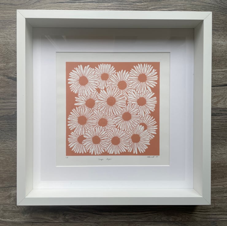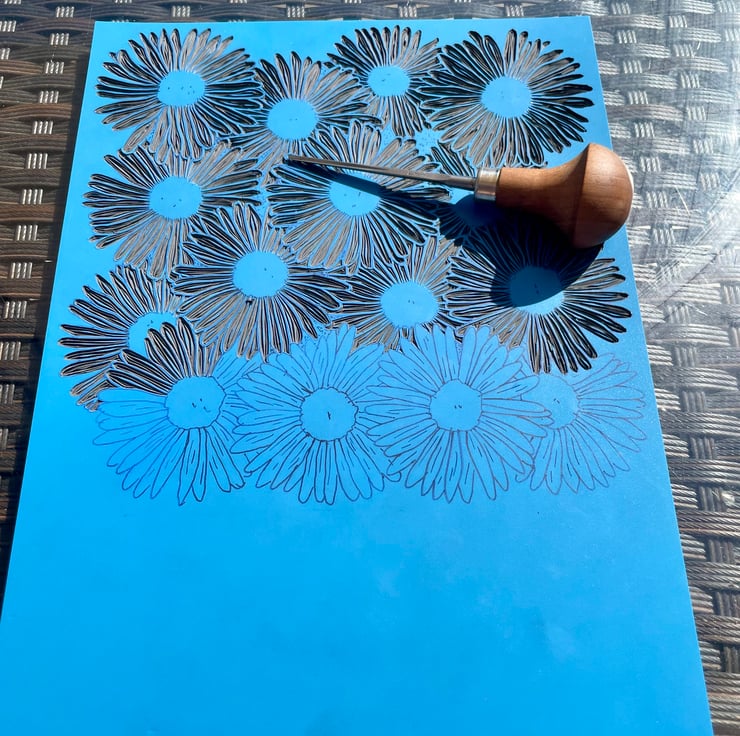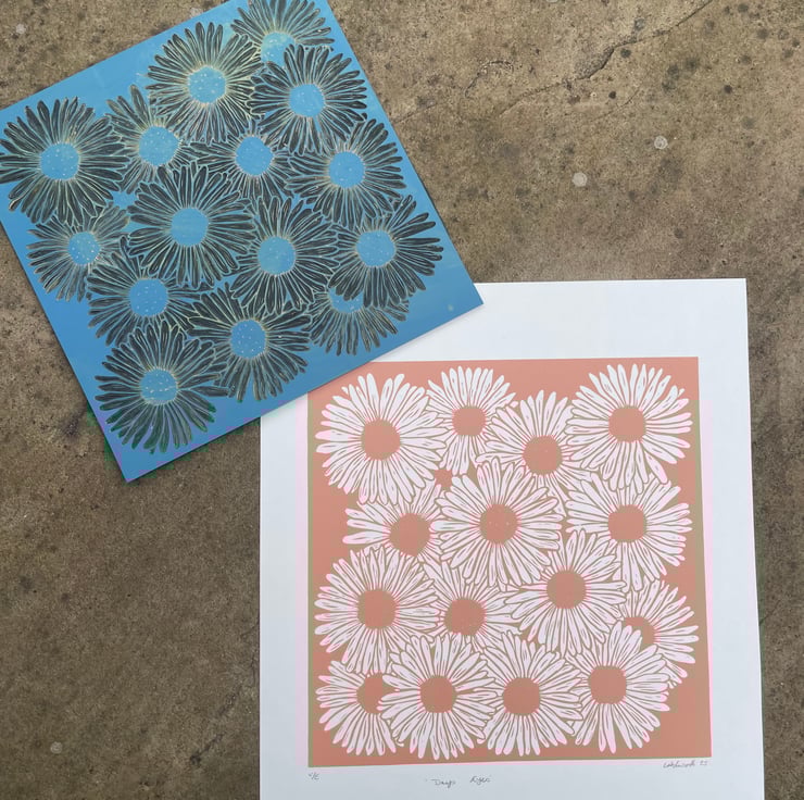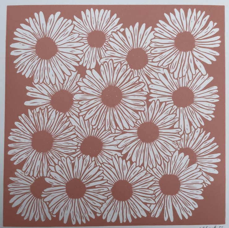 With this daisy print I wanted to capture the feel of a dense patch of daisies in full bloom with the flowers over lapping. I also wanted it to be a one colour print with the white of the petals being the paper. This was initially supposed to be a quick print but the design developed and got larger in size!