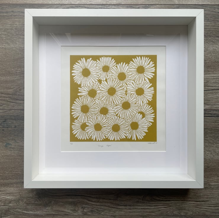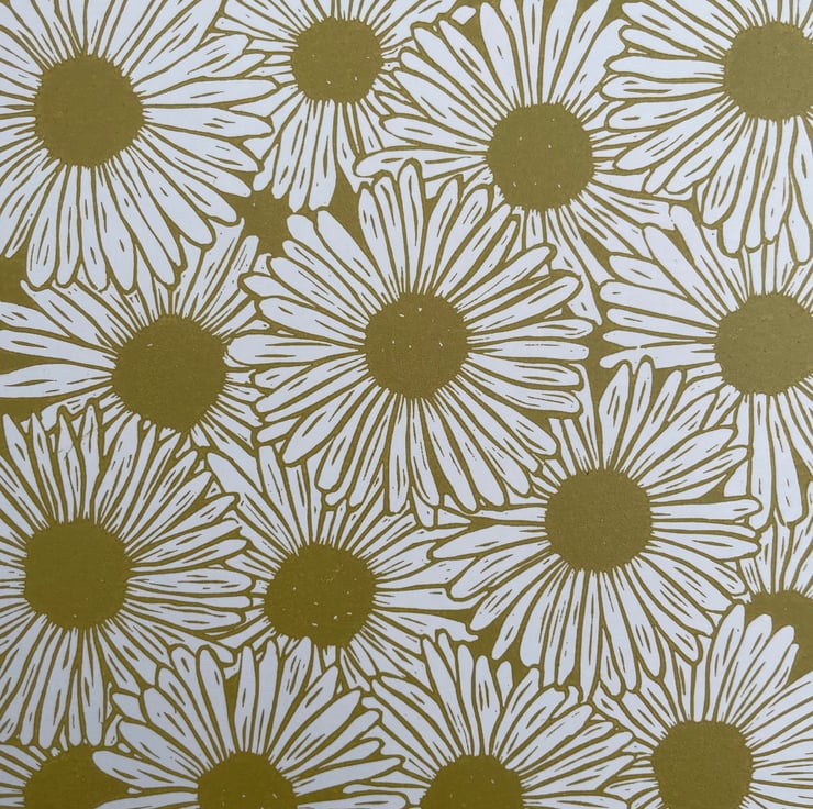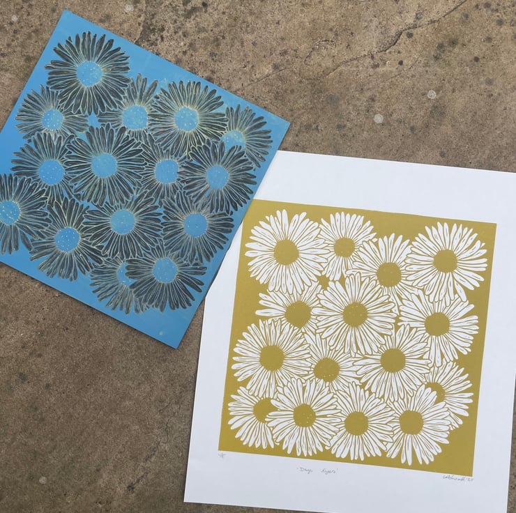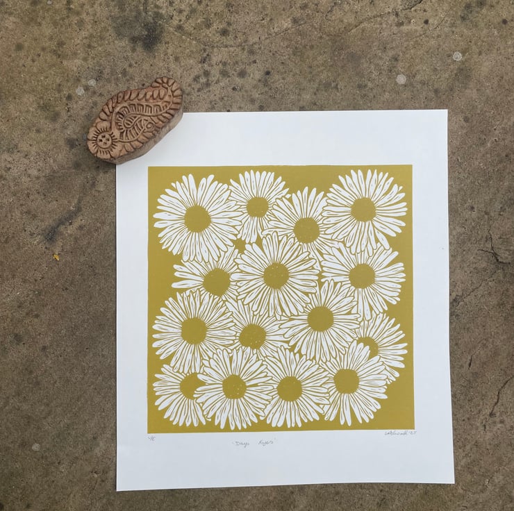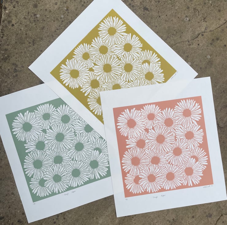 With this daisy print I wanted to capture the feel of a dense patch of daisies in full bloom with the flowers over lapping. I also wanted it to be a one colour print with the white of the petals being the paper. This was initially supposed to be a quick print but the design developed and got larger in size!