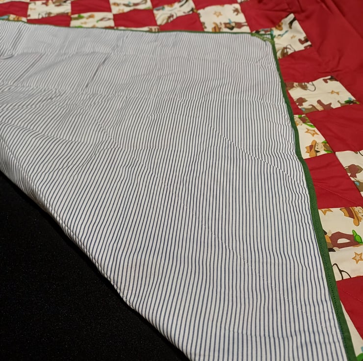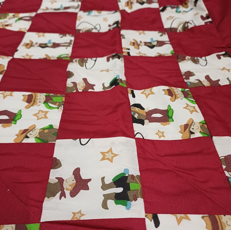 This bright cowboy blanket can also be used as a playmat measuring 38 inches by 42 inches approx. it is a good size for play or to put on a bed, the fabric is a mixture of poly cotton and cotton, the front is made up from a deep red and a cowboy print patchwork with a nice wadding in the middle and the backing is a blue and white strips, this is perfect for any boys room, it can be washed on a 40 wash