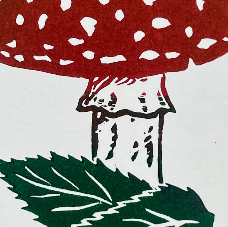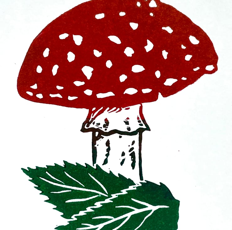 This two colour fly agaric toadstool has been hand carved and hand inked and printed. The fly agaric is with birch leaves as they can often be found where birch trees are.