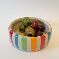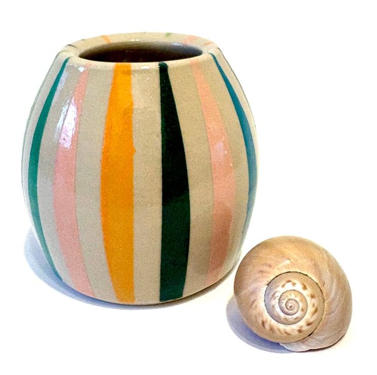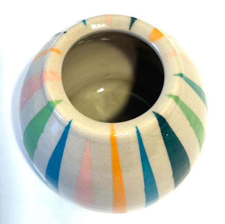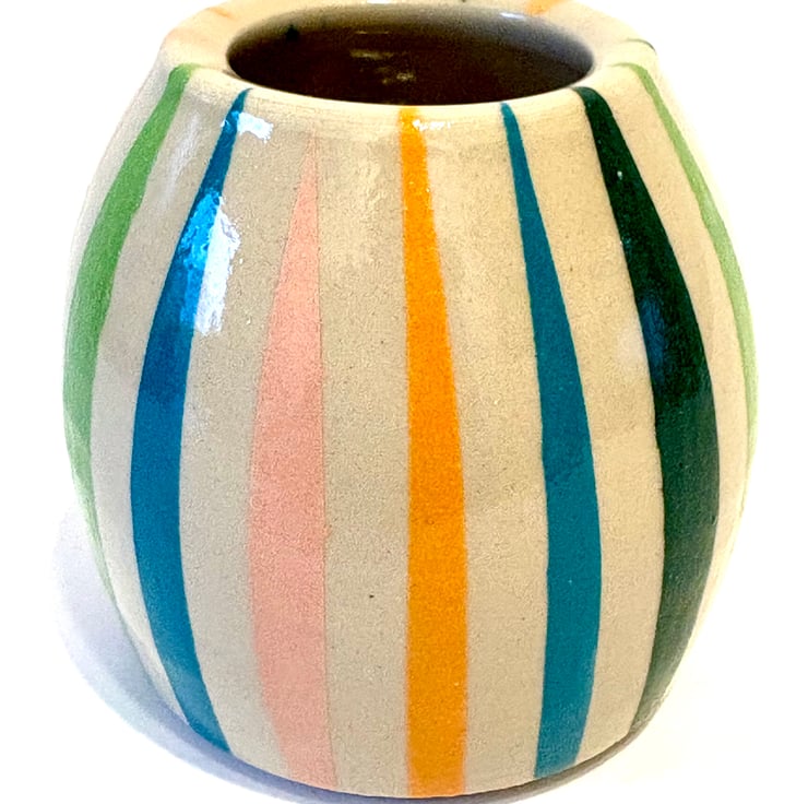 This sweet little stoneware pot has been painted with a range of underglaze shades mixed up in my home studio. A coat of shiny clear glaze makes it ready to use. Fill it with flowers or admire it as it is….makes a cute little gift!