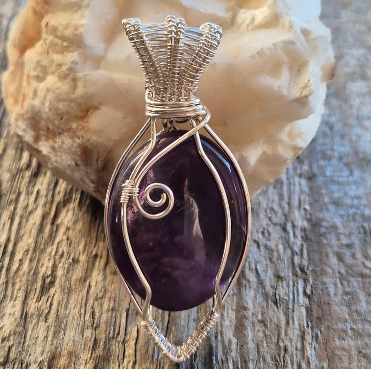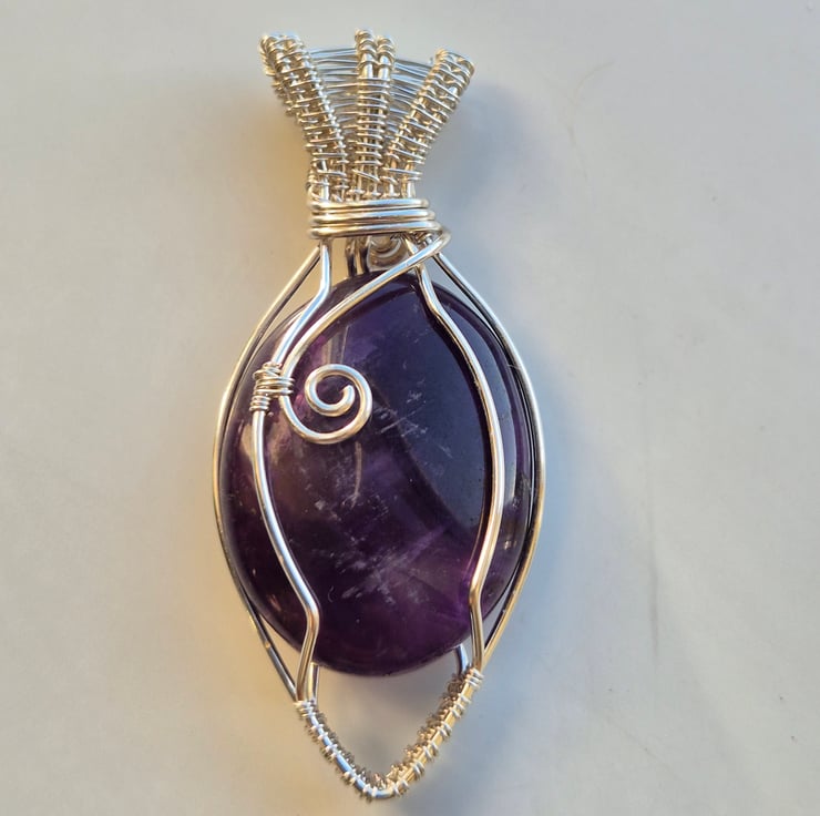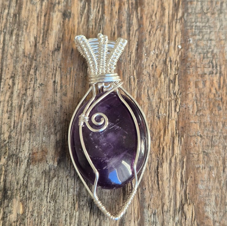 This handmade pendant features a natural Amethyst stone with deep purple colouring, wrapped securely in silver plated wire. The wire design is shaped by hand to highlight the smooth, polished stone while keeping the overall look simple and elegant.