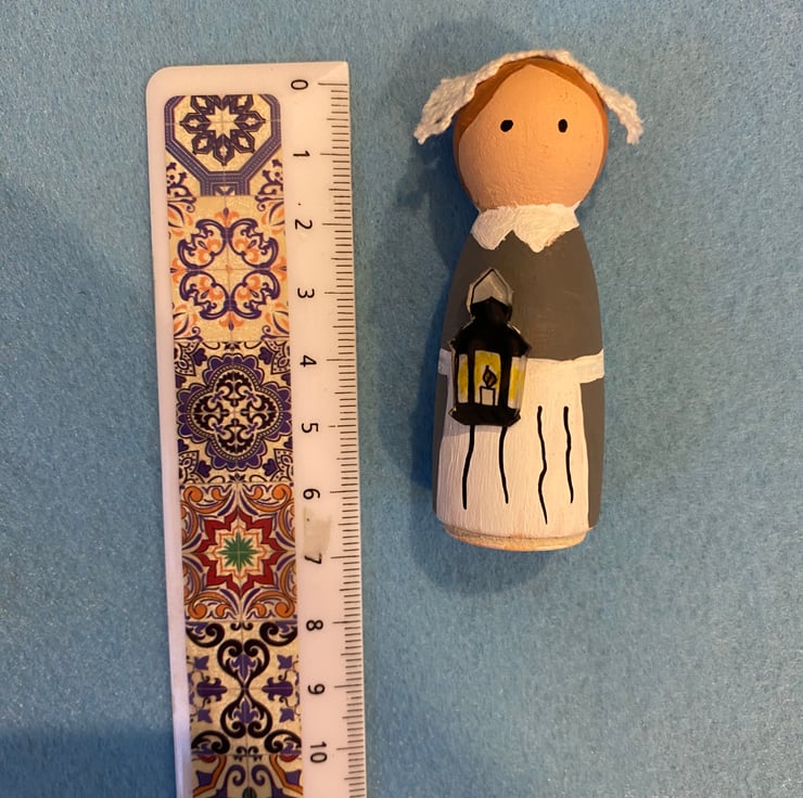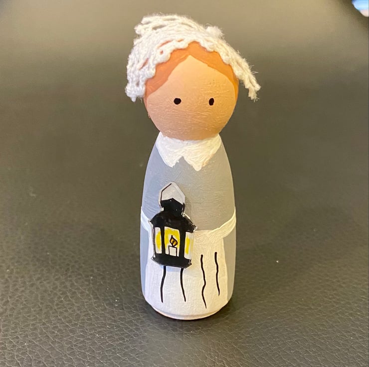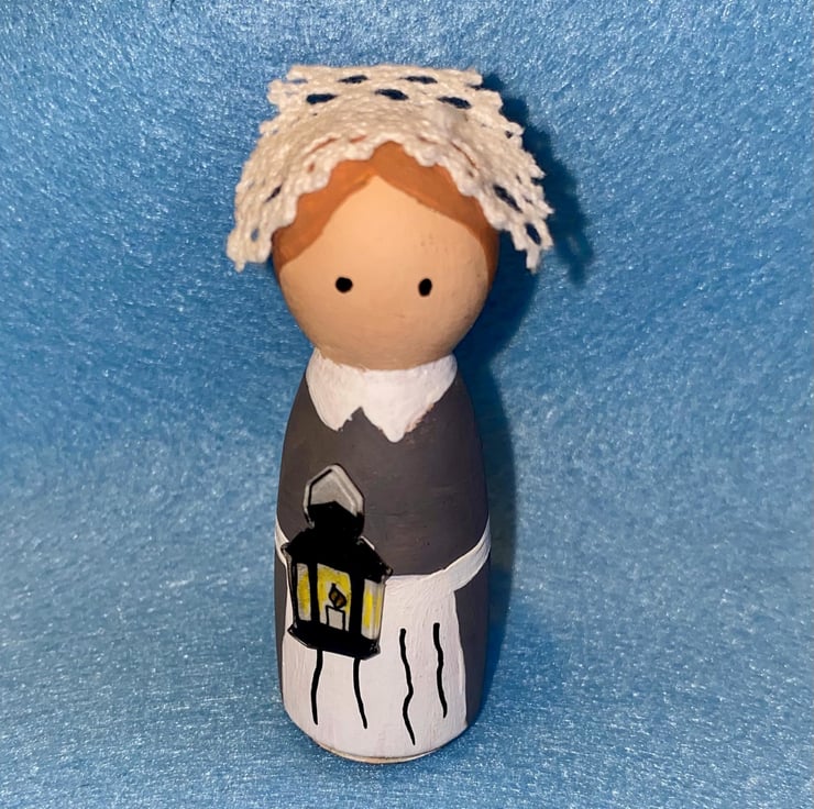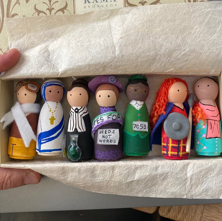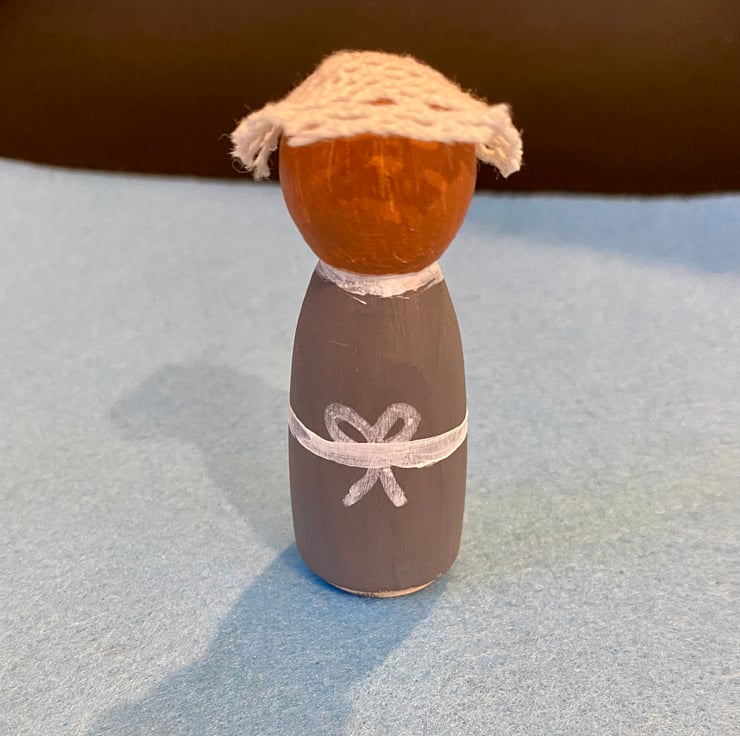 This small wooden peg doll is hand-painted and decorated with cotton trim and with shrinkiedink accessories. She measures approximately 6.5cm tall and is free standing. Other figures in this 'inspirational women' collection include Mary Anning, Marie Curie, Emmeline Pankhurst and Jane Goodall - to name but a few! Pleas check out my shop to view the full range. Custom requests also taken.