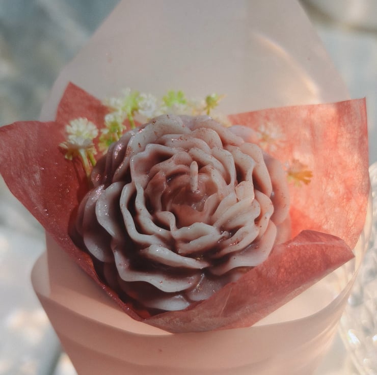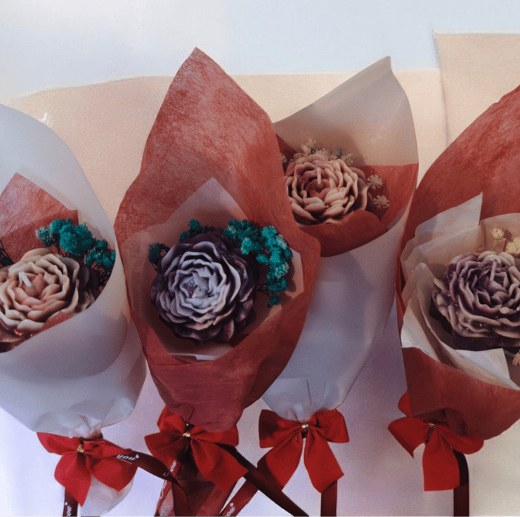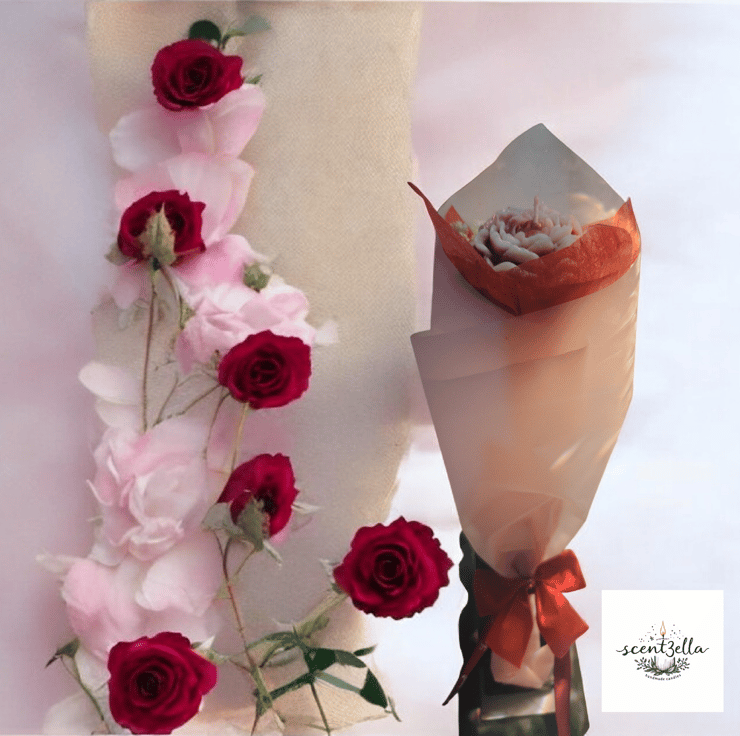 Bring romantic boutique charm to your home with Scentella’s exquisite Wrapped Flower Candle. Designed to look like a beautifully presented hand-tied bouquet, it features a delicate pale-toned wax flower nestled in layered soft and copper-hued wrapping, finished with a rich red bow. Framed by cascading white blooms and vibrant red roses against a gentle pastel backdrop, this candle captures the timeless beauty of fresh florals in a lasting form.