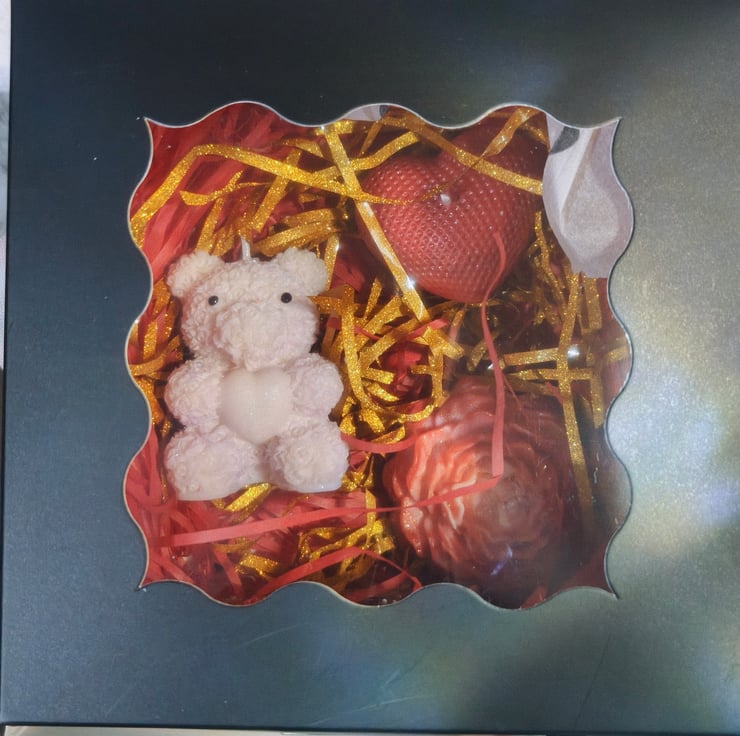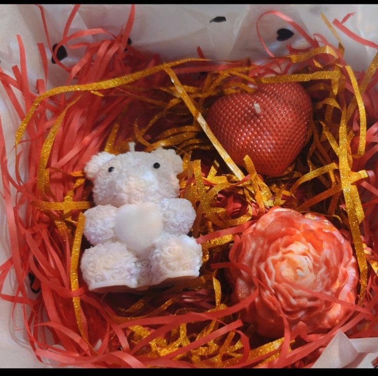Treat your special someone to this charming handcrafted candle gift set – perfect for celebrating love on Valentine’s Day, anniversaries, or any occasion that calls for romance. The set includes three uniquely designed candles nestled in vibrant red and gold shredded paper, presented in heart-patterned packaging: