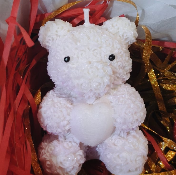 - A fluffy white teddy bear candle holding a heart (symbolizing tender affection)