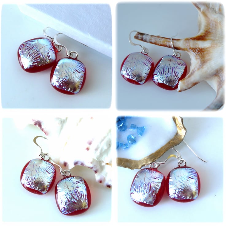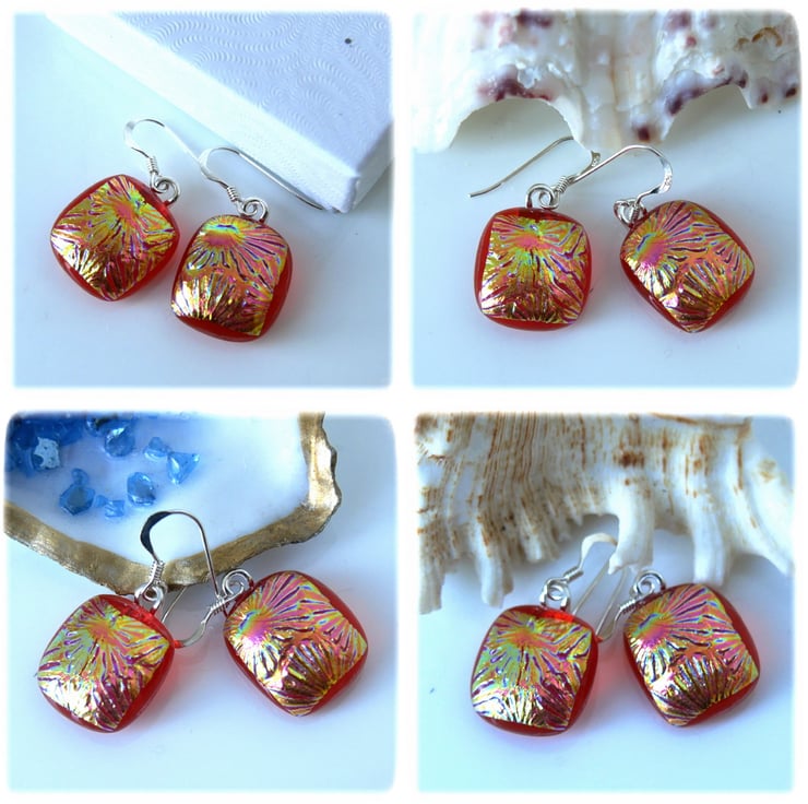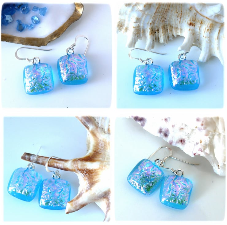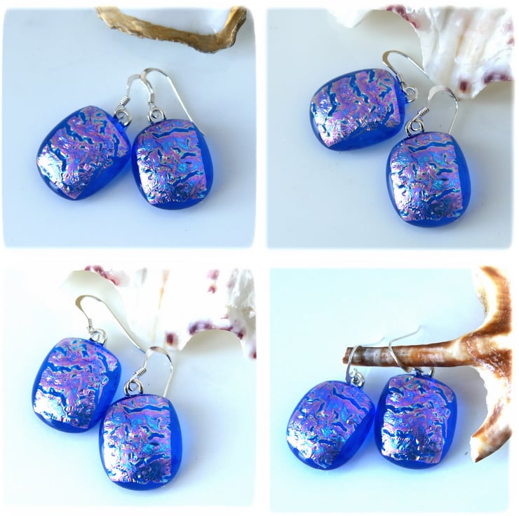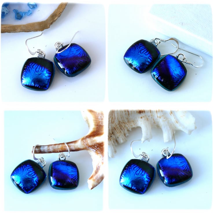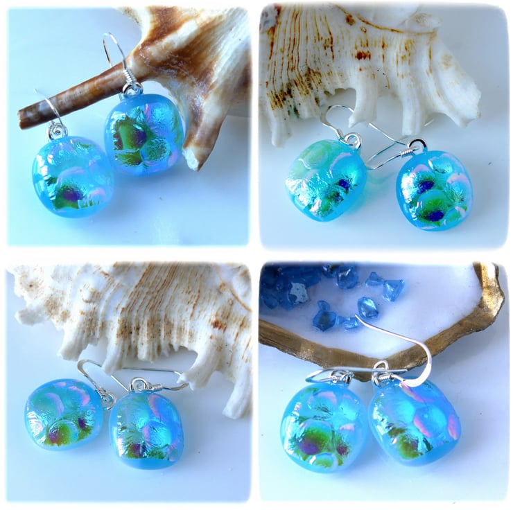 I've taken several photos of the earrings to try to show you the colour which changes in the light. this is a feature of wonderful dichroic glass.