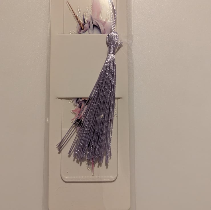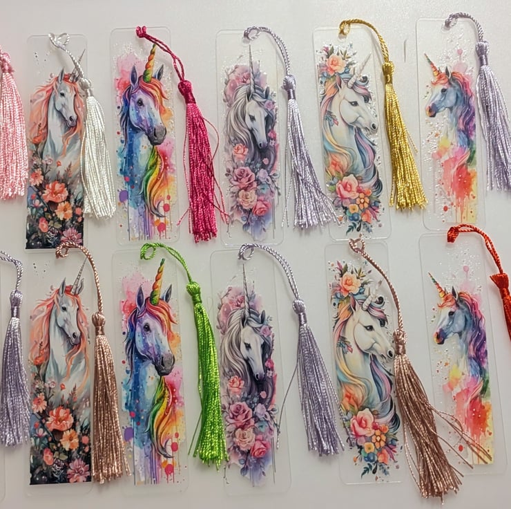 Acrylic colourful Unicorn design bookmarks 12 cm by 3.2 cm with a colour tassel. Each bookmark comes with a special card holder and cellophane bag. Six different designs available. Please message to say which you prefer otherwise a random design will be sent.