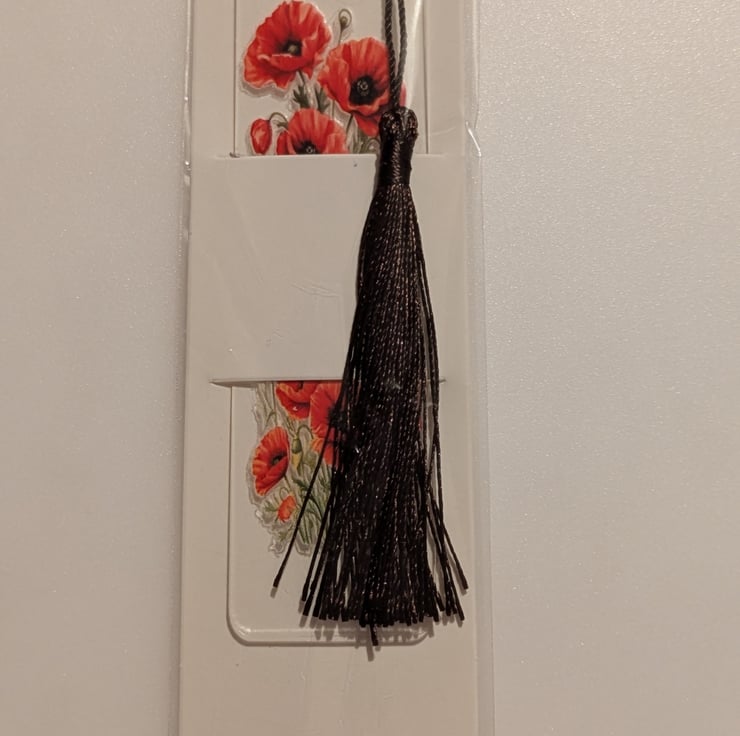 Acrylic red poppy design bookmark with tassel. These bookmarks are made by hand using transfers.12 cm by 3.2 cm. A random poppy design will be sent unless you message to request a certain design. Great way of adding colour to the pages of your book.. Lovely gift for a book lover. Each bookmark comes in a bookmark holder with a cellophane bag.