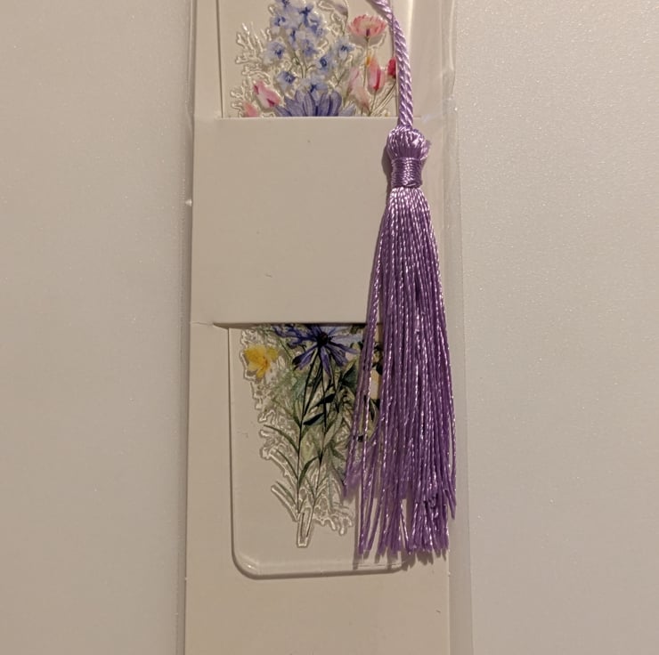Acrylic floral themed bookmark with tassel. 12 cm by 3.2 cm. These bookmarks are hand decorated using transfers. Each bookmark comes in a bookmark holder and cellophane bag. Please message which bookmark you require otherwise a random bookmark will be sent.