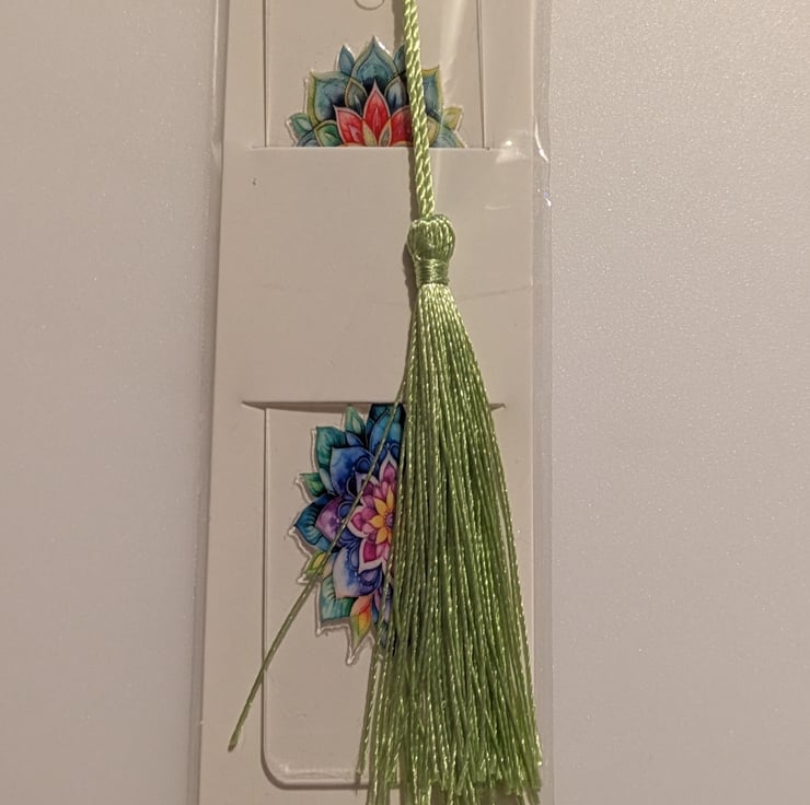 Acrylic abstract pattern theme bookmark with tassel. 12 cm by 3.2 cm . Handmade using transfers. Each bookmark comes in a holder and cellophane bag. Please message if you require a certain bookmark otherwise a random design will be sent. Great gift for book lovers.