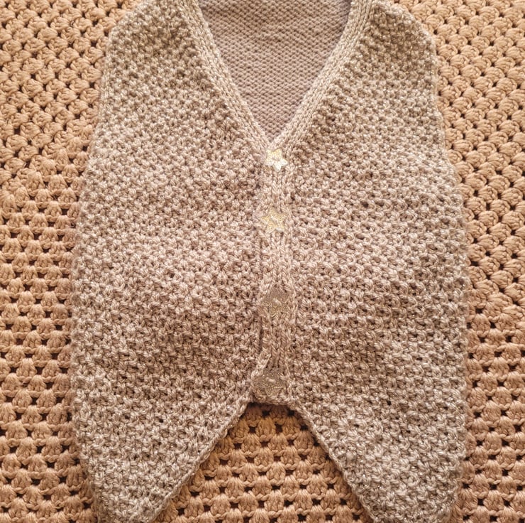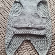 Hand knitted in pink sparkle yarn . This is a half to 3/4 length coat . Would suit a long back lady dog. The chest measurement is most important. Chest 18 inches. Underside 11 inches over-all length 15 inches. Machine washable on low.