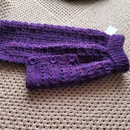 Hand knitted in pink sparkle yarn . This is a half to 3/4 length coat . Would suit a long back lady dog. The chest measurement is most important. Chest 18 inches. Underside 11 inches over-all length 15 inches. Machine washable on low.