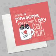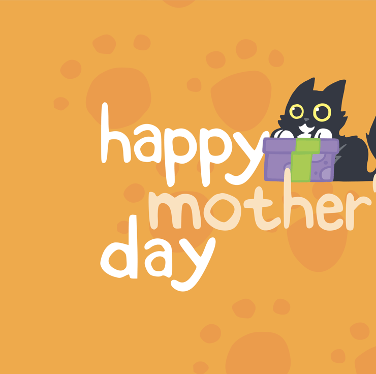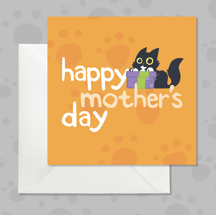An adorable Mother’s Day card made just for cat mums. This bright orange design features a playful tuxedo cat with big yellow eyes, perched beside a purple present box. Sweet, quirky, and full of personality – a perfect pick for cat mums everywhere.