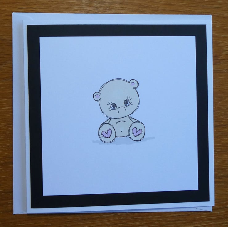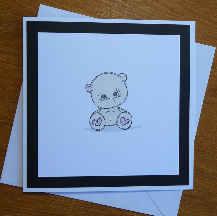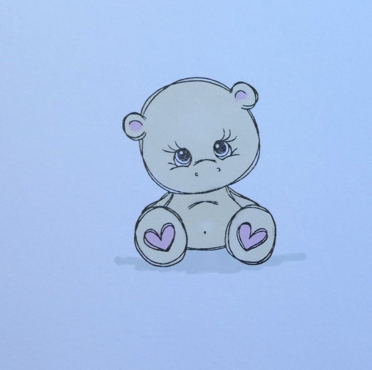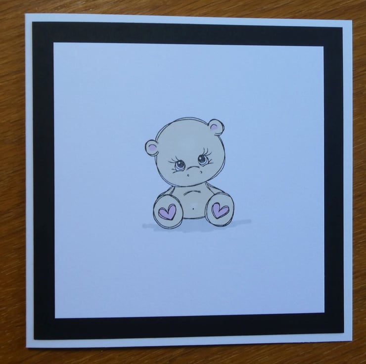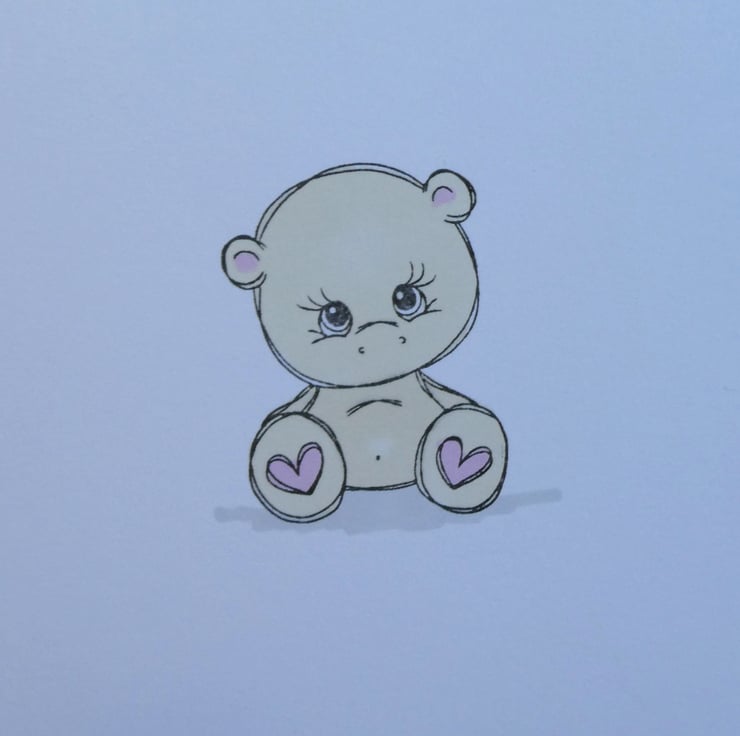 This simple card features a hand stamped bear coloured in soft pink and beige tones.