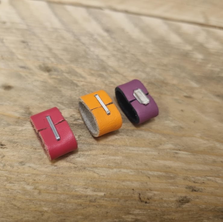 This product is a set of two genuine leather belt loops or keepers, measuring 15mm in width. The belts come in a range of vibrant colours including pink, purple, and orange. Designed in the United Kingdom, these accessories are perfect for adding a stylish touch to your leathercraft creations. Whether you are crafting belts or other leather accessories, these loops will help you keep your designs secure and organised.