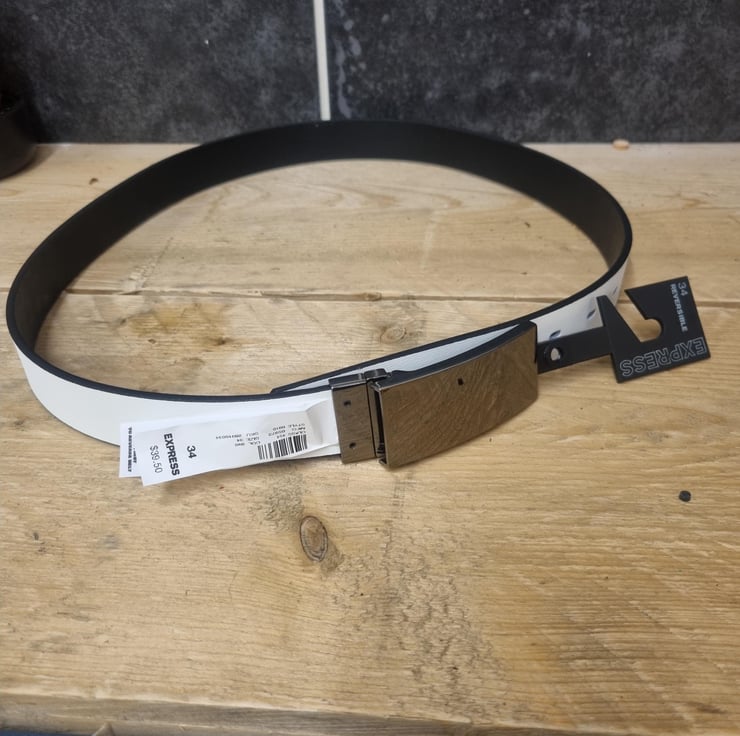 This Men's Express Reversible Split Leather Belt is a stylish accessory perfect for any wardrobe. Made from a combination of faux leather and genuine leather, it features a sleek black and white design that is versatile and on-trend. The reversible feature adds a unique touch, while the buckle accent adds a finishing touch to the classic design. The size 30 to 36 is ideal for a comfortable fit, making it a must-have for any man looking to elevate his outfit.