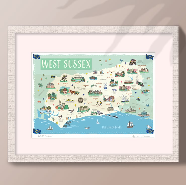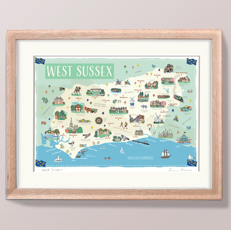 Beautiful illustrated A4 wall map of the English county of West Sussex, including Chichester, Worthing, Arundel, and the beautiful South Downs.