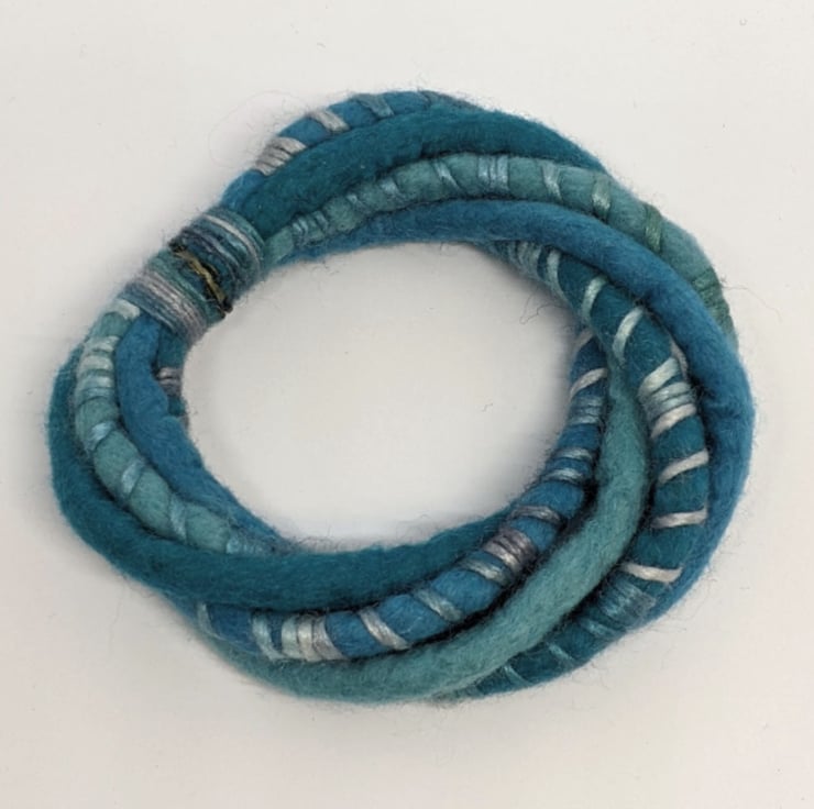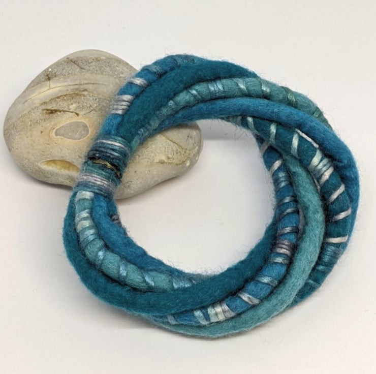 This handmade wet felted bangle twists together felted cords of soft merino wool in shades of turquoise, wrapped with a toning lustrous merino and silk blend yarn. It closes with a strong magnetic fastening.