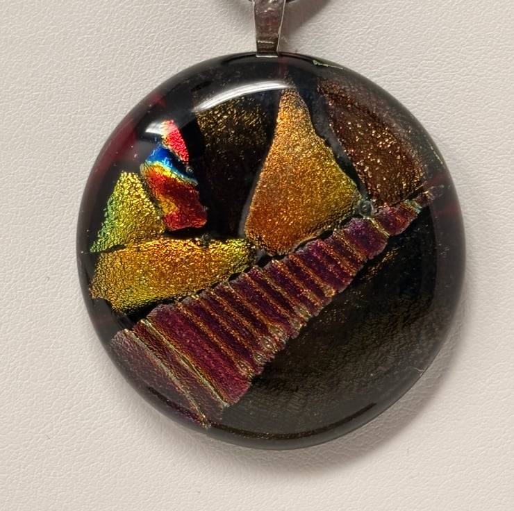 Fused glass circular pendant made with dichroic glass, with cord necklace.