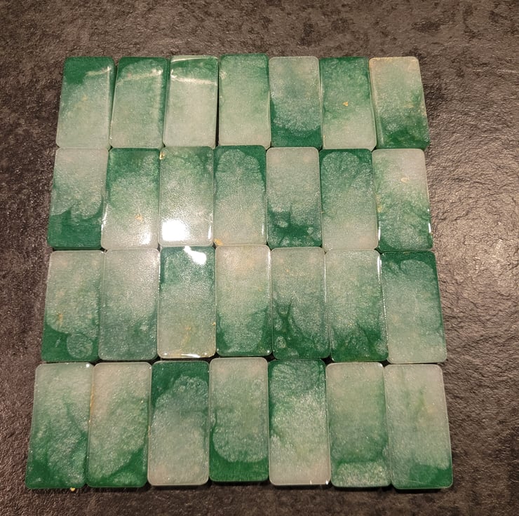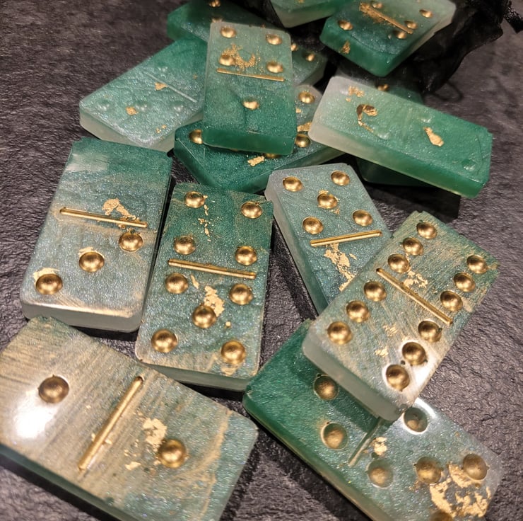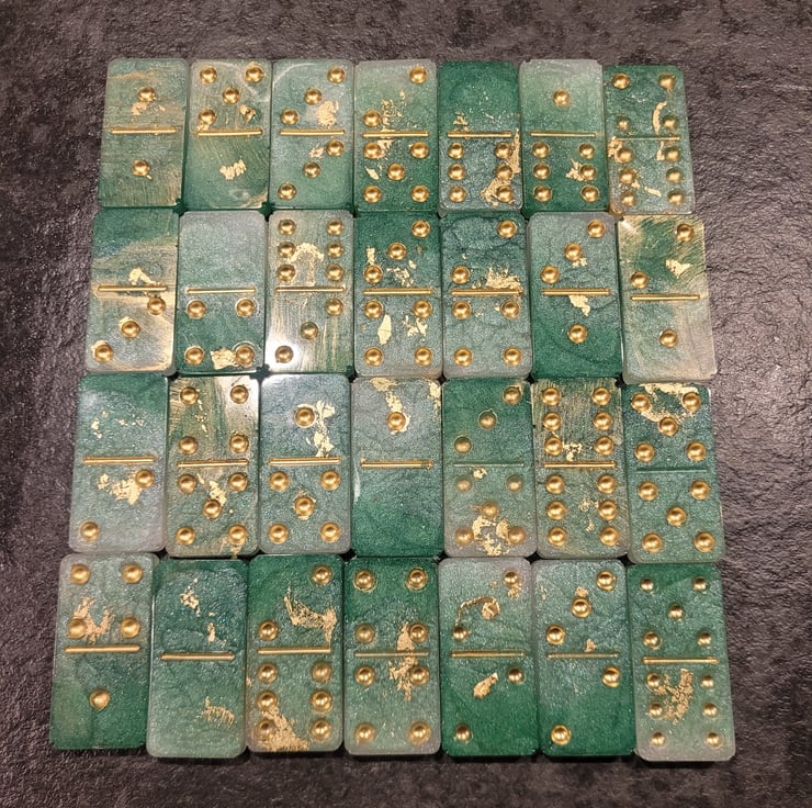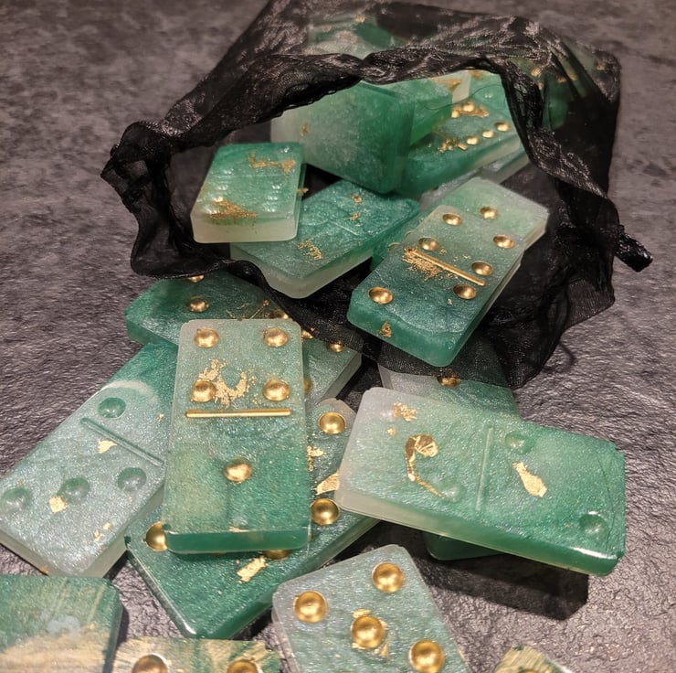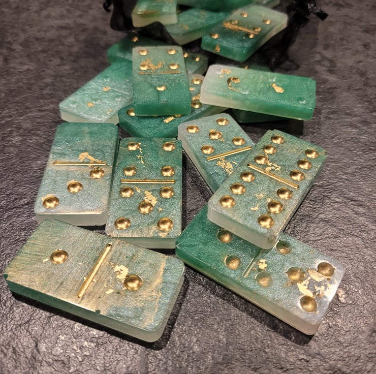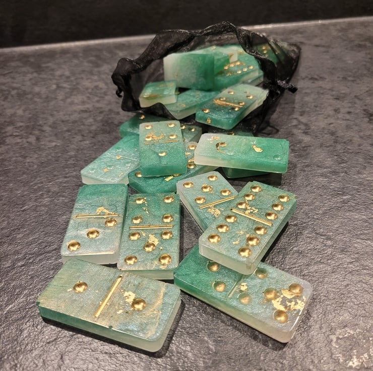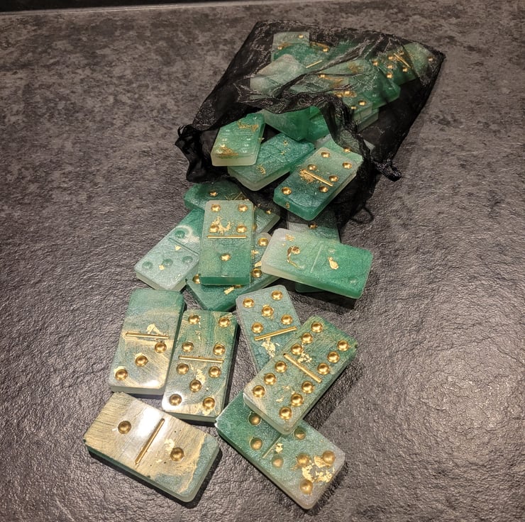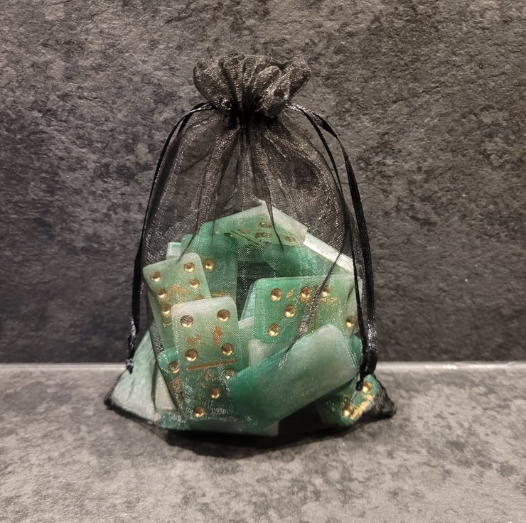 Handmade Resin Dominoes. Various colours and designs, also made to order if you have something special in mind. Full set of 28 Dominoes. Light weight so excellent for travel. Comes in an organza bag for easy storage.