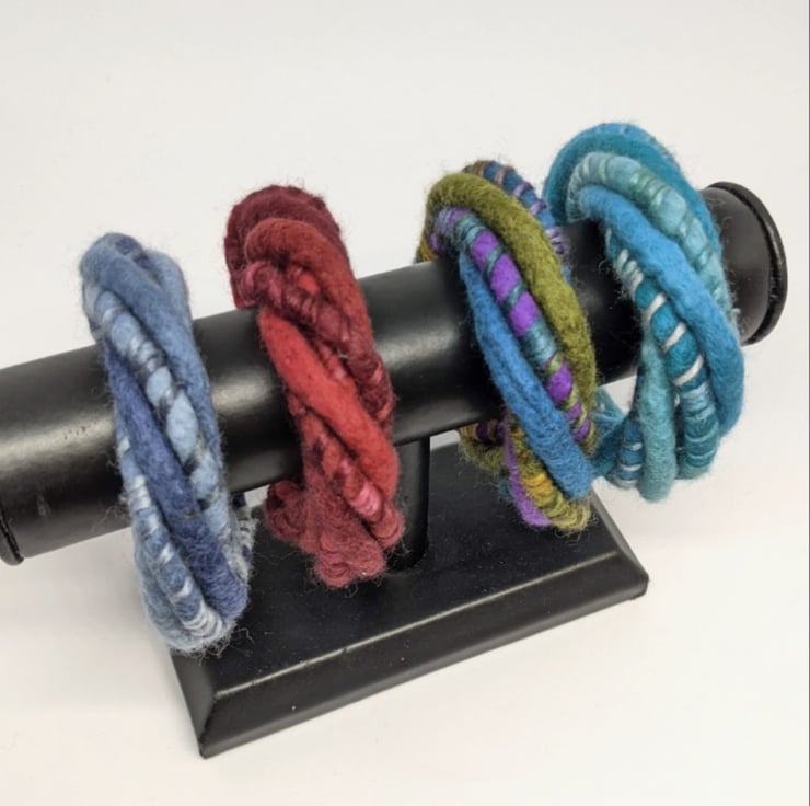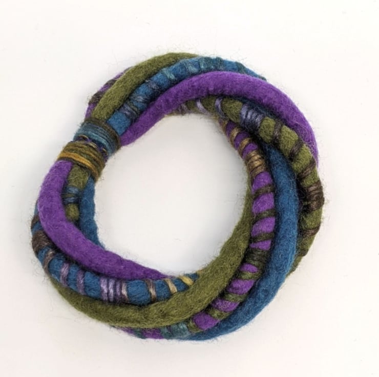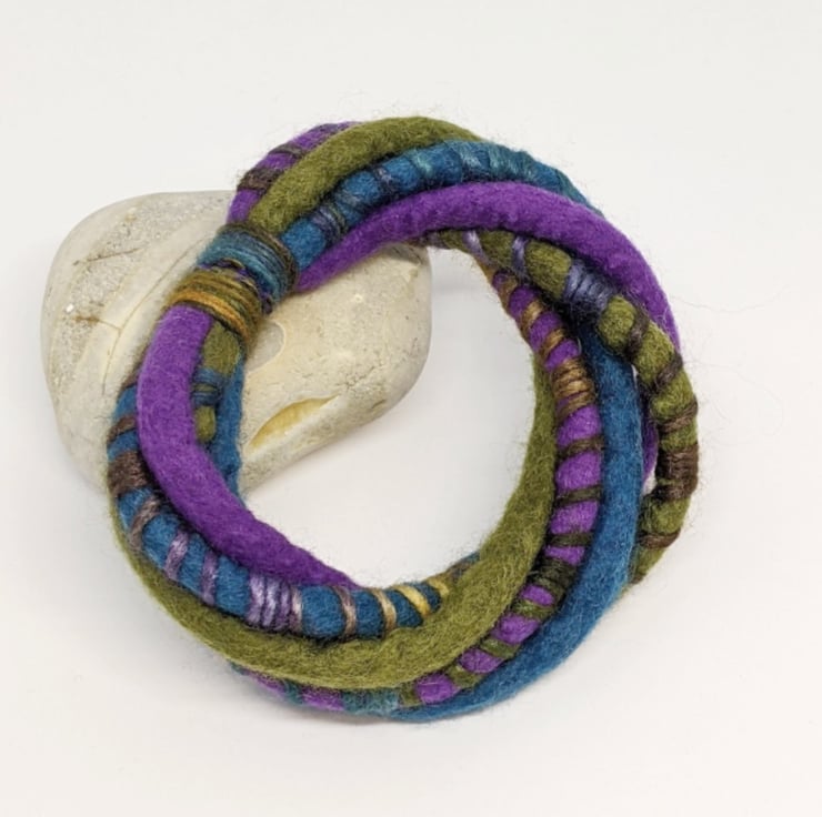 This handmade wet felted bangle twists together felted cords of soft merino wool in shades of purple, olive and aquamarine blue, wrapped with a toning lustrous merino and silk blend yarn. It closes with a strong magnetic fastening.