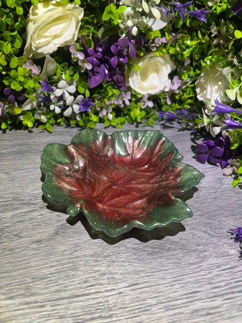 A handmade maple leaf tray in red and green. Approximately 15.5cm x 13.5cm x 2.5cm, perfect for jewellery, keys, chocolates, soap, you name it! Each piece is unique and comes gift-wrapped, perfect for gifting or treating yourself.