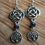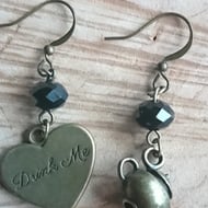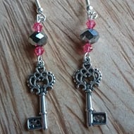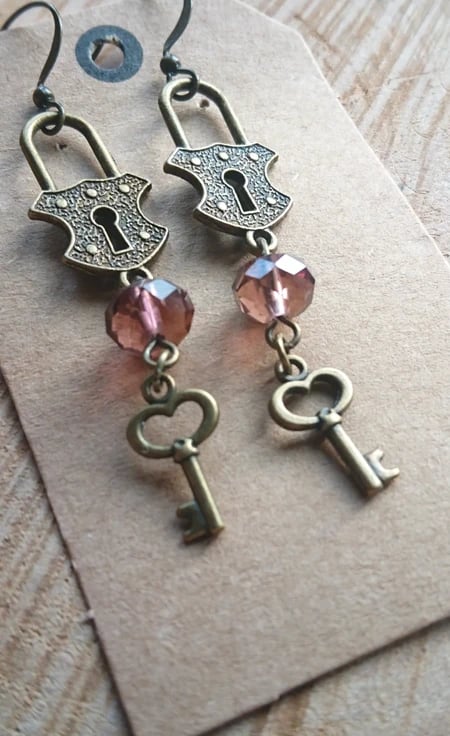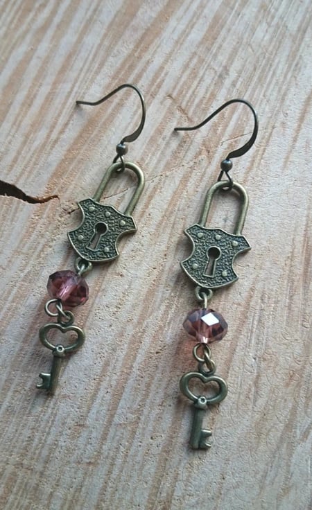 Antique effect metal lock and key charms with purple faceted crystal beads. Long dangle approx 5cm drop.