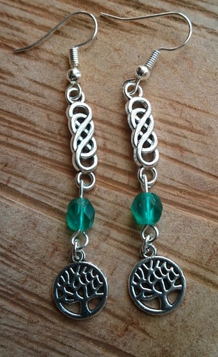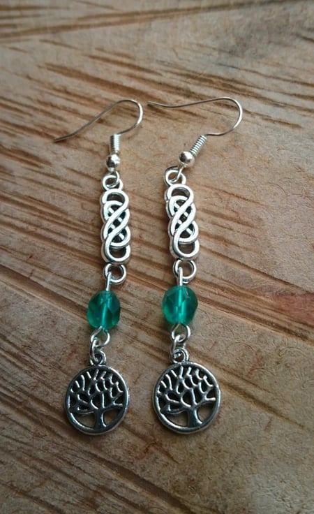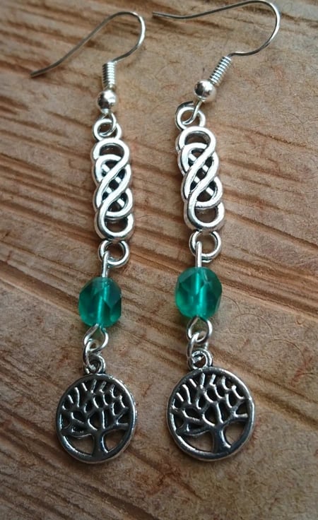 Silver tone tibetan silver tree of life and celtic knot charms with faceted green glass beads.