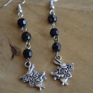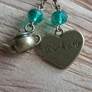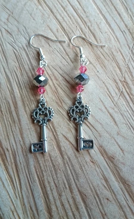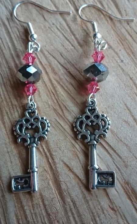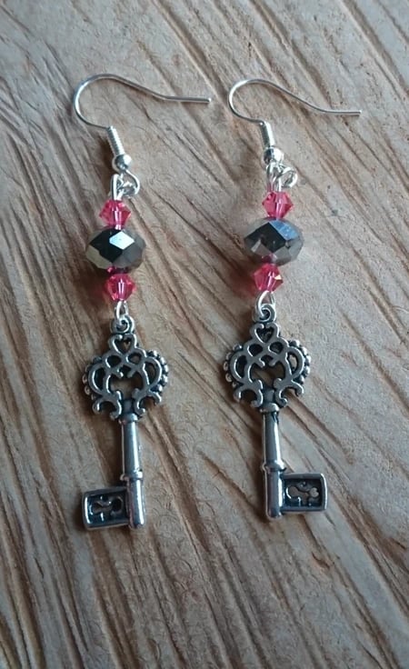 Long dangle handmade Steampunk key charms (tibetan silver) with gunmetal faceted glass and bright pink crystal beads. Approx drop is 4.5cm. Come carded and in gift bag.