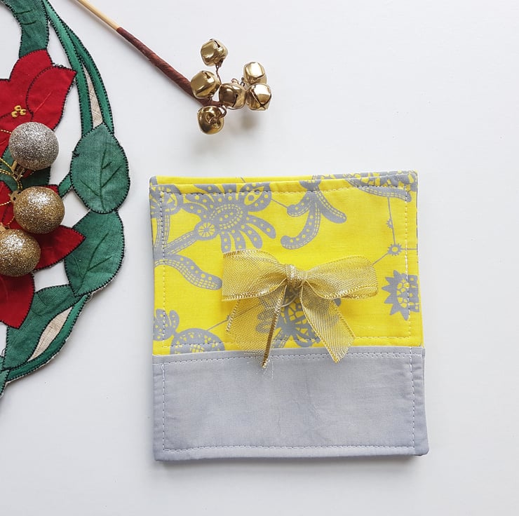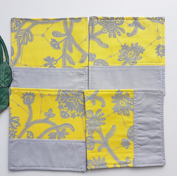 Perfect housewarming gift, drinks mats or table protectors. A lively yellow and grey floral pattern.