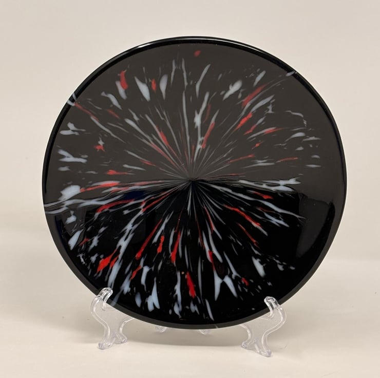 This striking hand-fused glass bowl is created using the frit stretch technique, resulting in a dynamic, flowing design full of movement and depth. A rich black base provides dramatic contrast, while streaks and bursts of blended colors stretch and swirl across the surface, creating a bold, contemporary look.