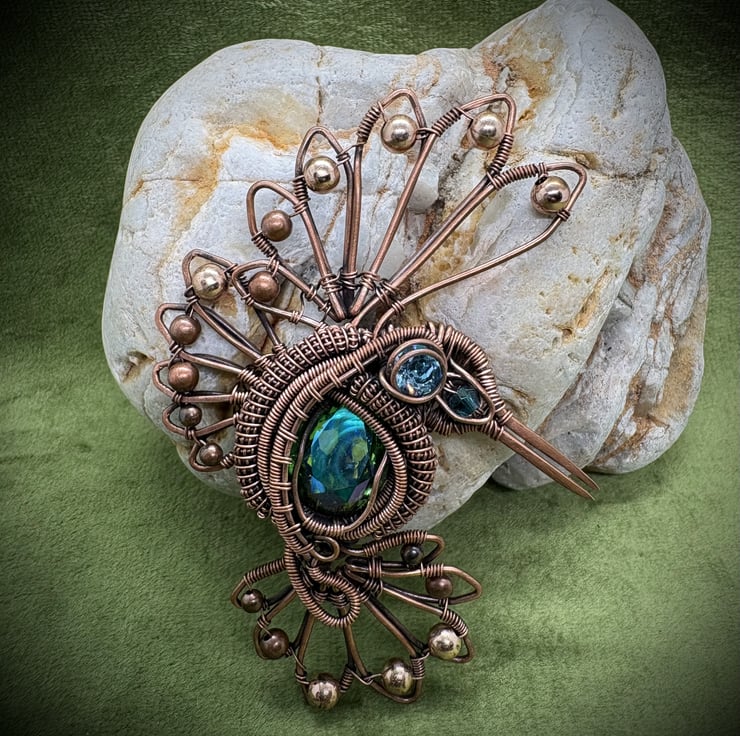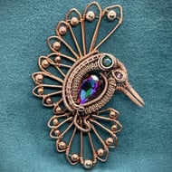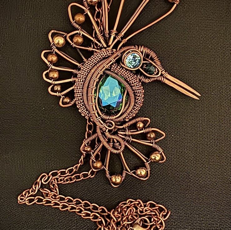 Antique copper wire wrapped hummingbird pendant with iridescent multi-coloured teardrop glass crystal centre detail and pure copper bead details in the wings. I use glass crystals bought from a very well-known Austrian crystal manufacturer. This crystal shimmers purple, blue and green colours.