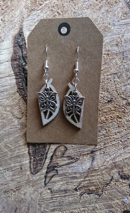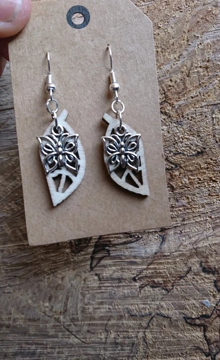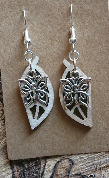cute butterfly tibetan silver charms on leaf shaped wooden background with nickel free wires and come carded and in gift bag. Great 3D effect earrings.