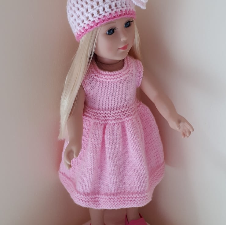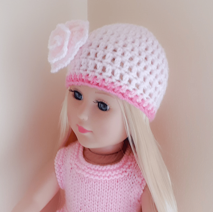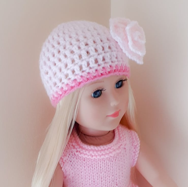 To fit doll Height 46 cm or 18 inches. The hat is crochet in double knitting yarn using 4 mm crochet hook.