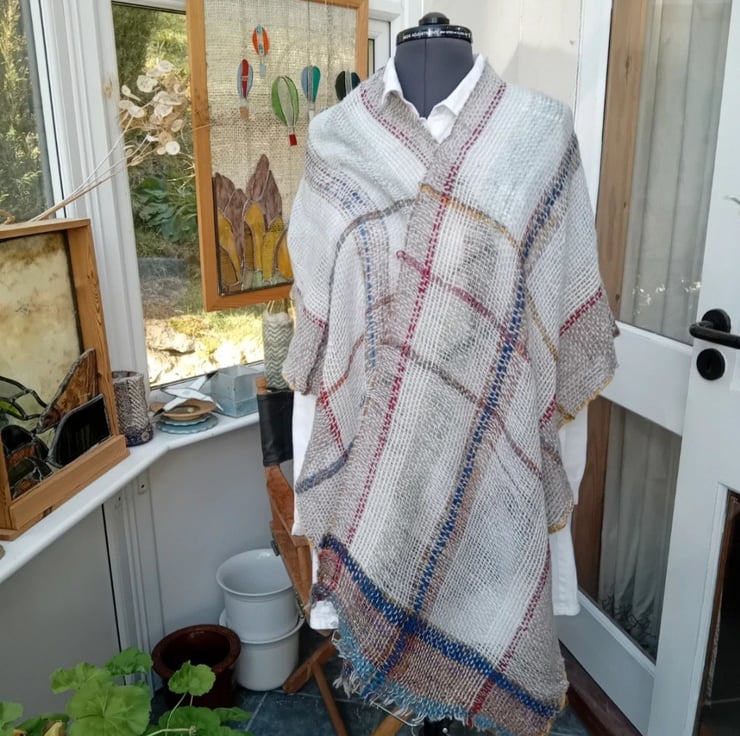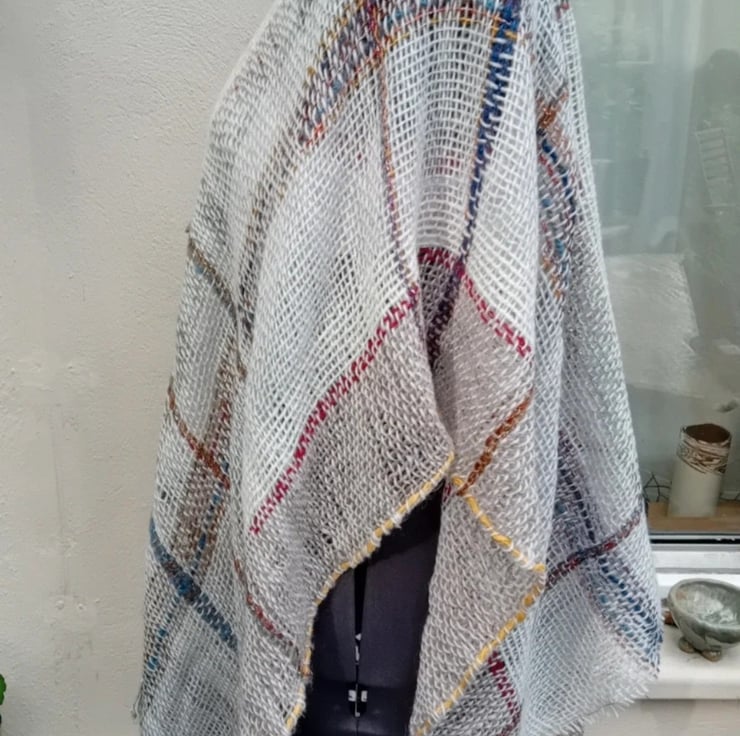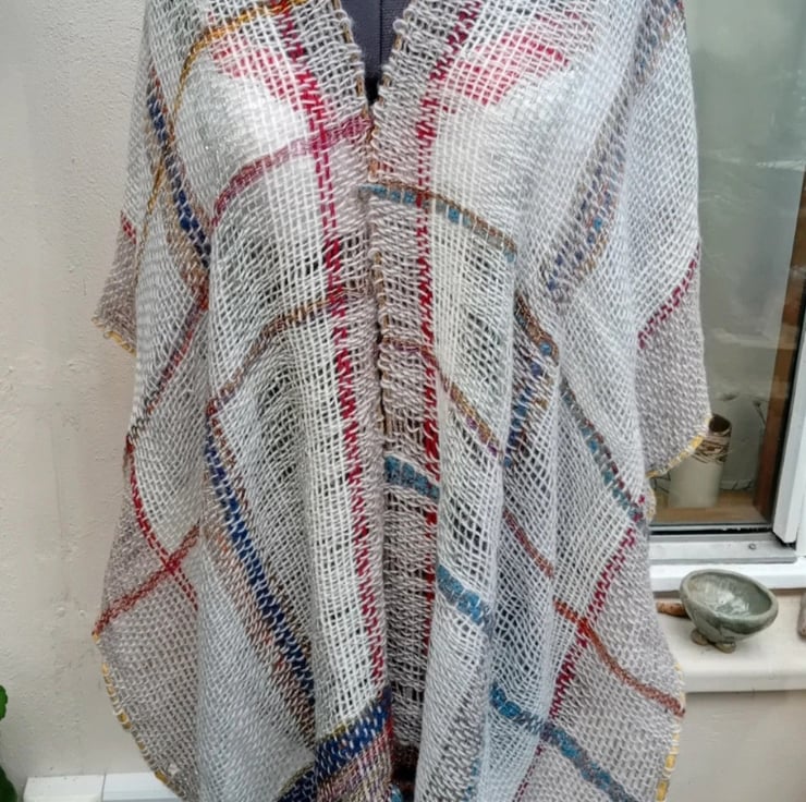 This poncho is perfect for wearing all the year round. Dove grey with sparkly multicoloured borders at both ends and a subtle check design through main part of cloth.