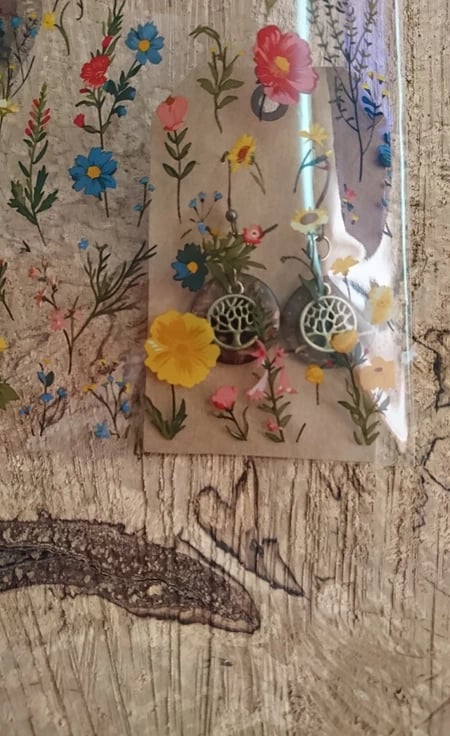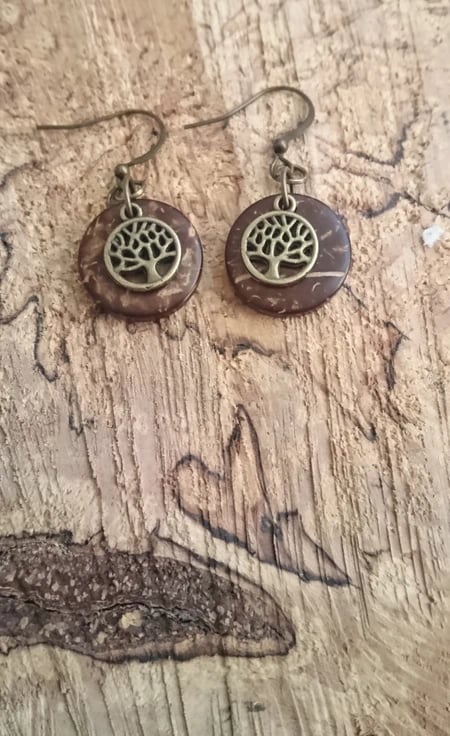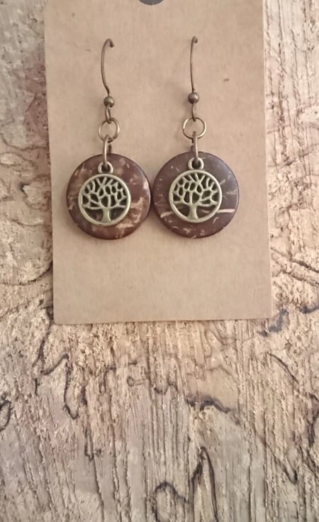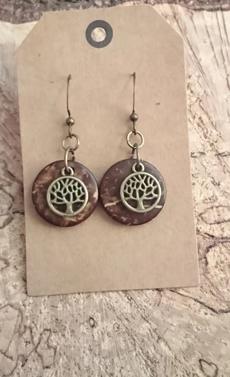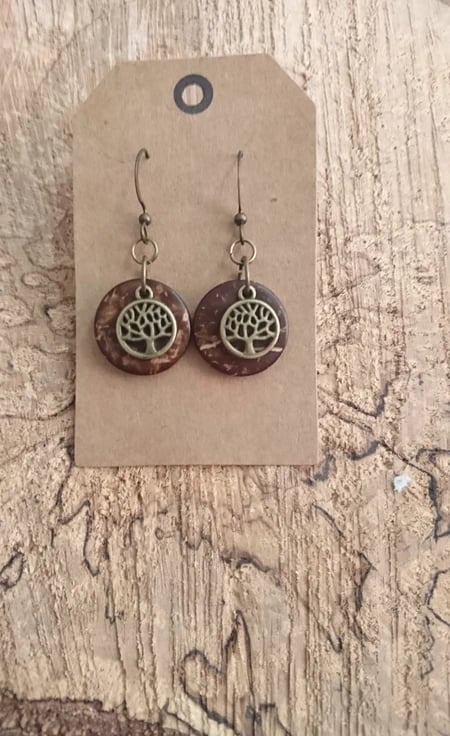 Tree of life antique effect charms on a coconut husk disc background, woodland and celtic themed earrings. Come carded and in gift bag. On nickle free wires.