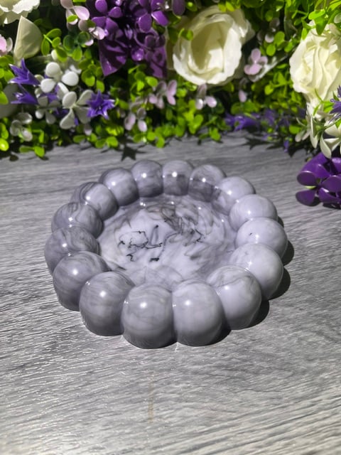 A handmade round bubble tray in black and white. Approximately 12.5cm in size, perfect for jewellery, keys, chocolates, soap, you name it! Each piece is unique and comes gift-wrapped, perfect for gifting or treating yourself.