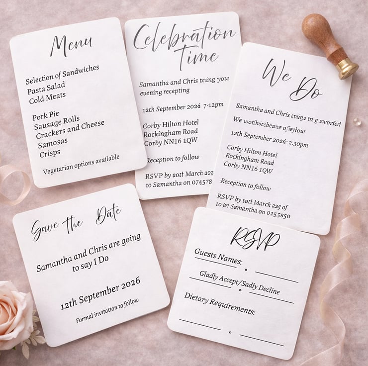 Ideal for including ceremony timings, reception details, evening celebrations, dietary requirements or any additional notes you’d prefer not to include on the main invitation. Each details card is professionally printed on high quality card and personalised with your own wording.