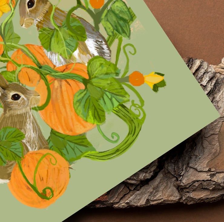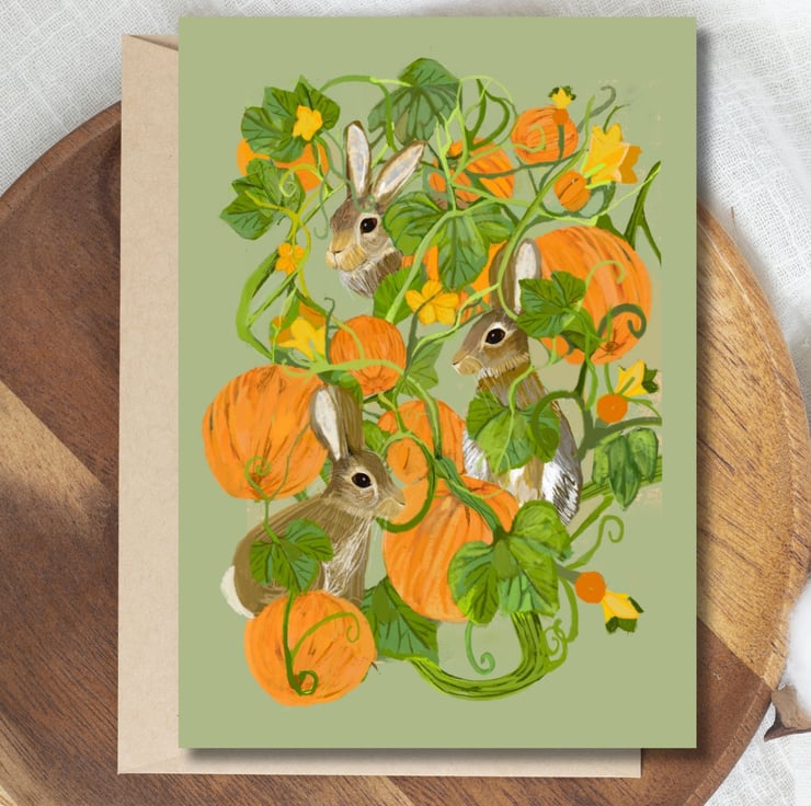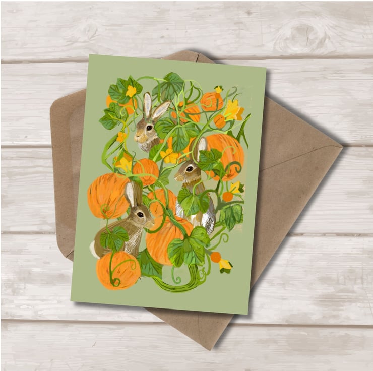 A trio of rabbits in the pumpkin patch. A cute card to send out a little message to someone or for special occasssions. Would also make a lovely birthday card for a child.
